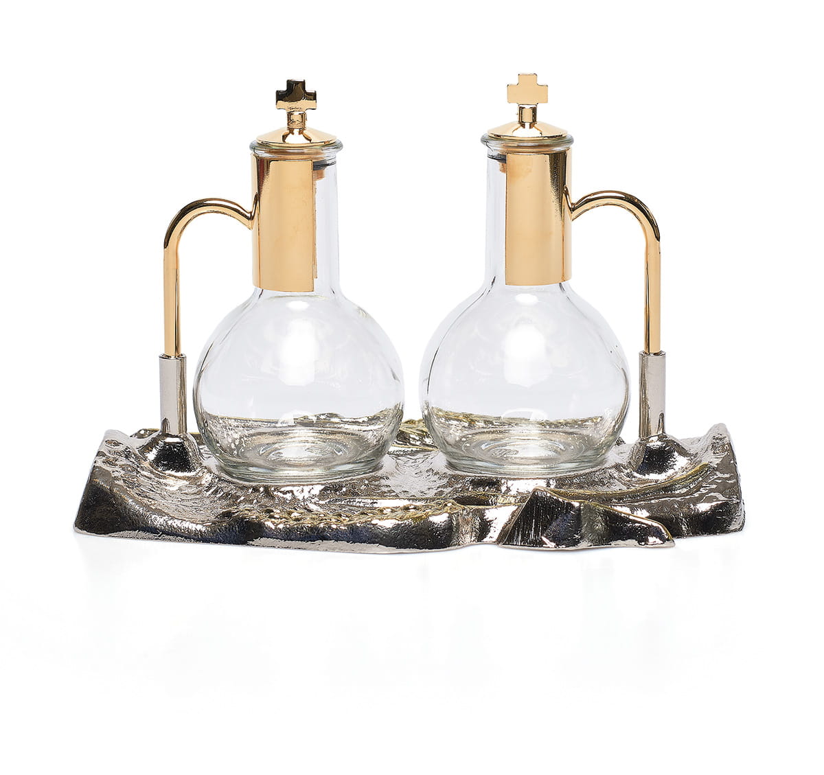 Taca jest metalowym odlewem niklowanym. Ampułki szklane z uchwytami i zatyczkami z krzyżykiem.