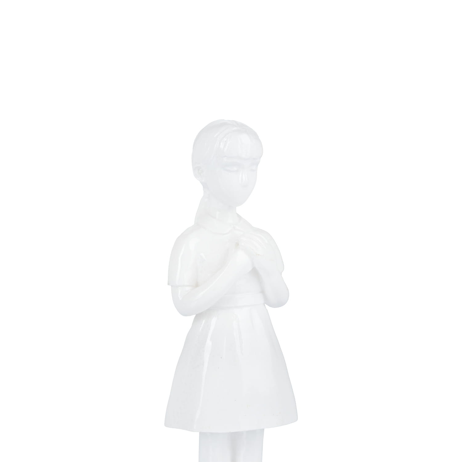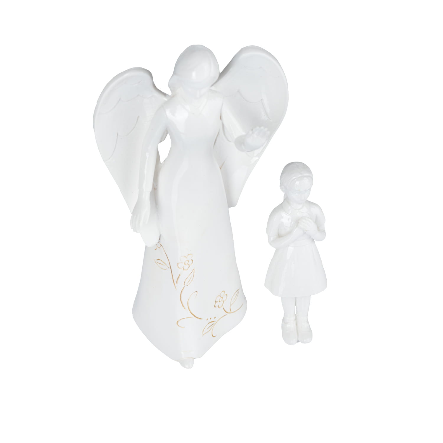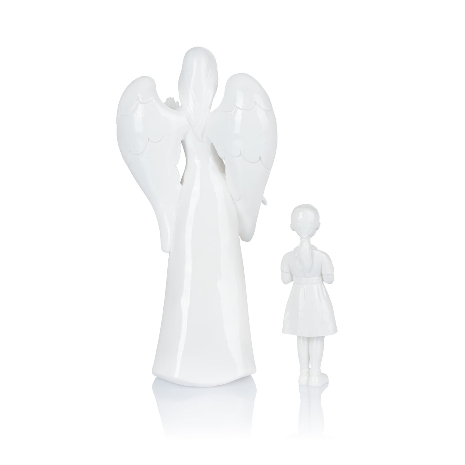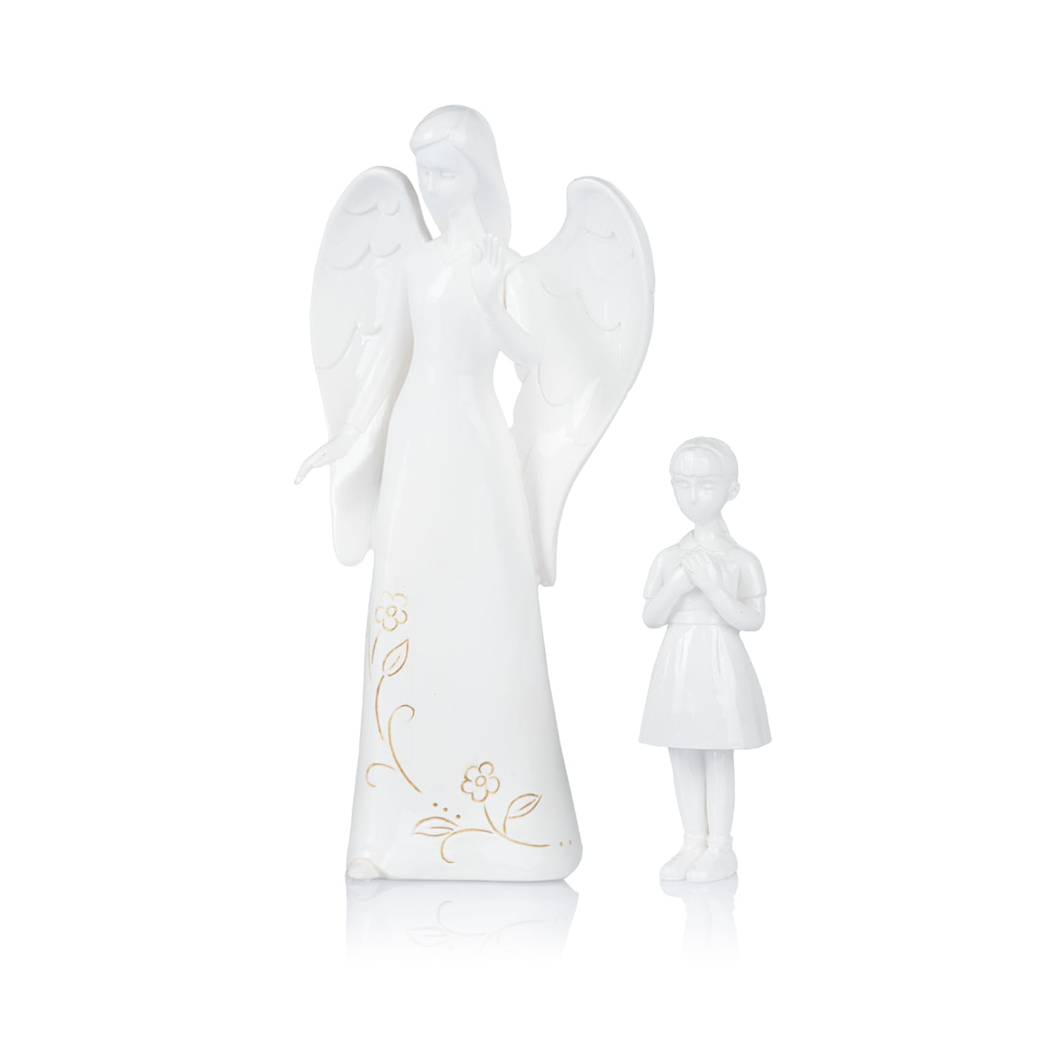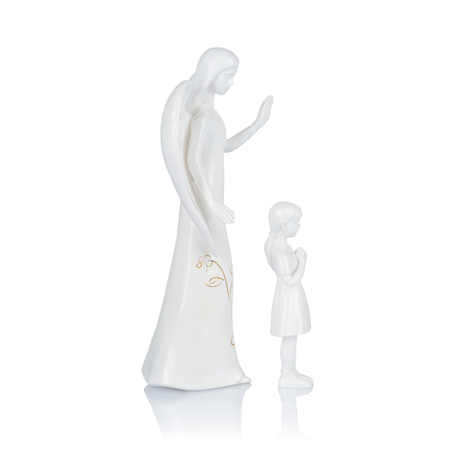 Anioł jest w towarzystwie małej dziewczynki. Dziewczynka ma delikatne rysy twarzy, które emanują spokojem i ufnością.