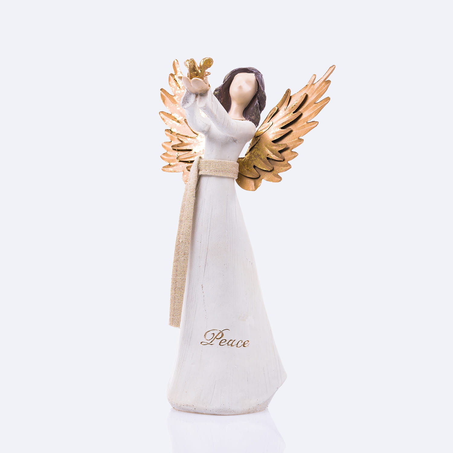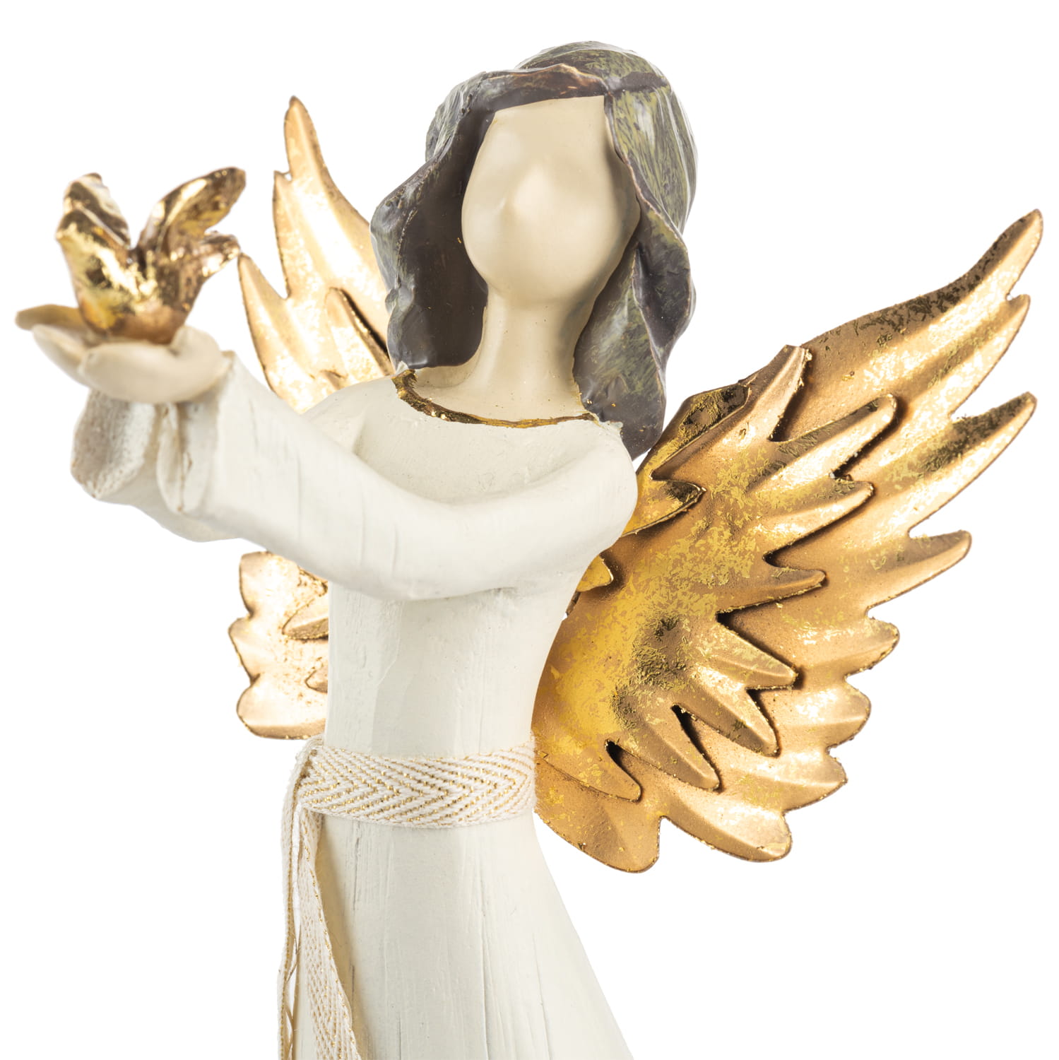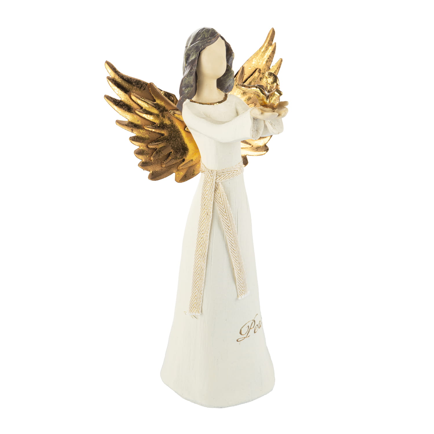 Anioł z gołębiem z napisem na sukni- hope (nadzieja). Skrzydełka anioła wykonane są z metalu w kolorze złotym. Figura malowana jest ręcznie.