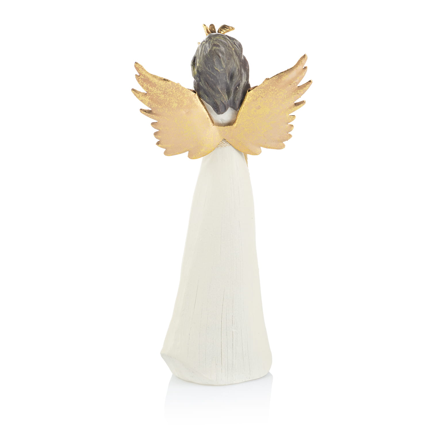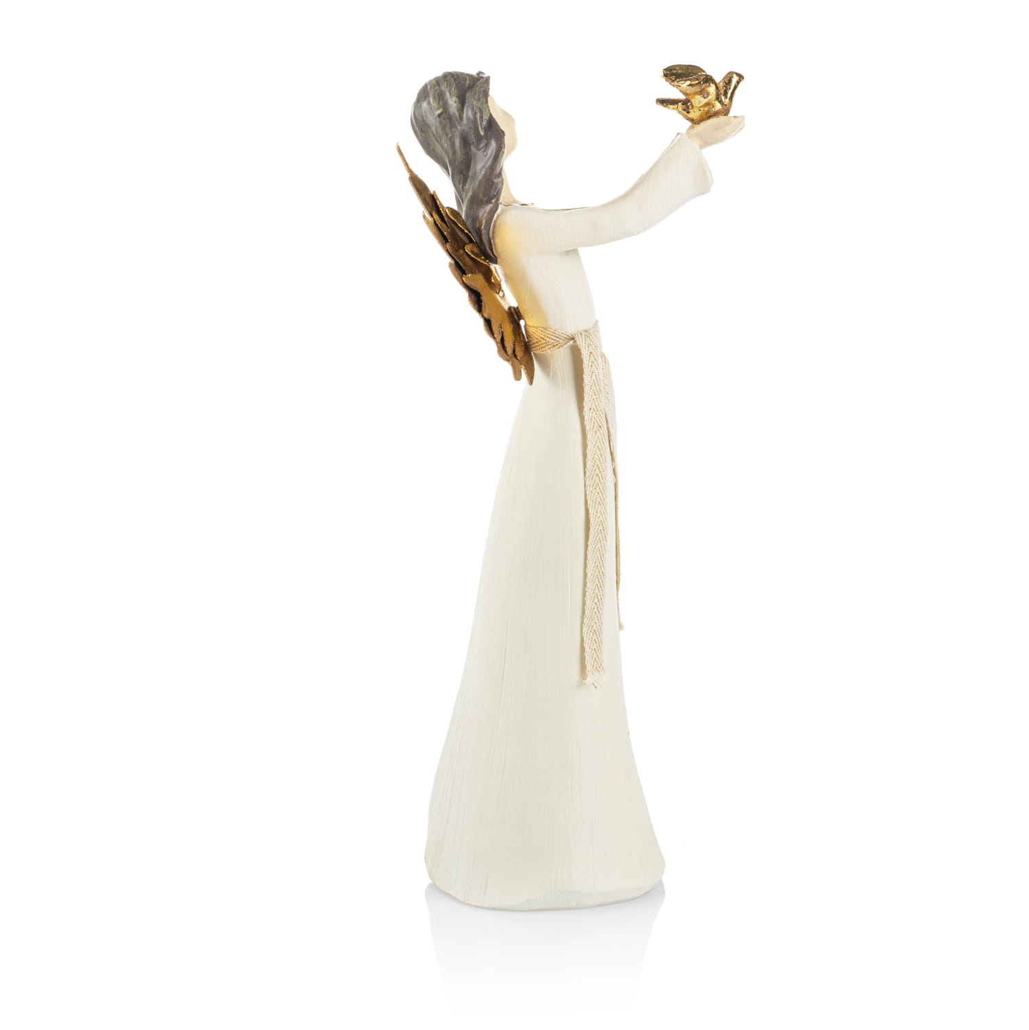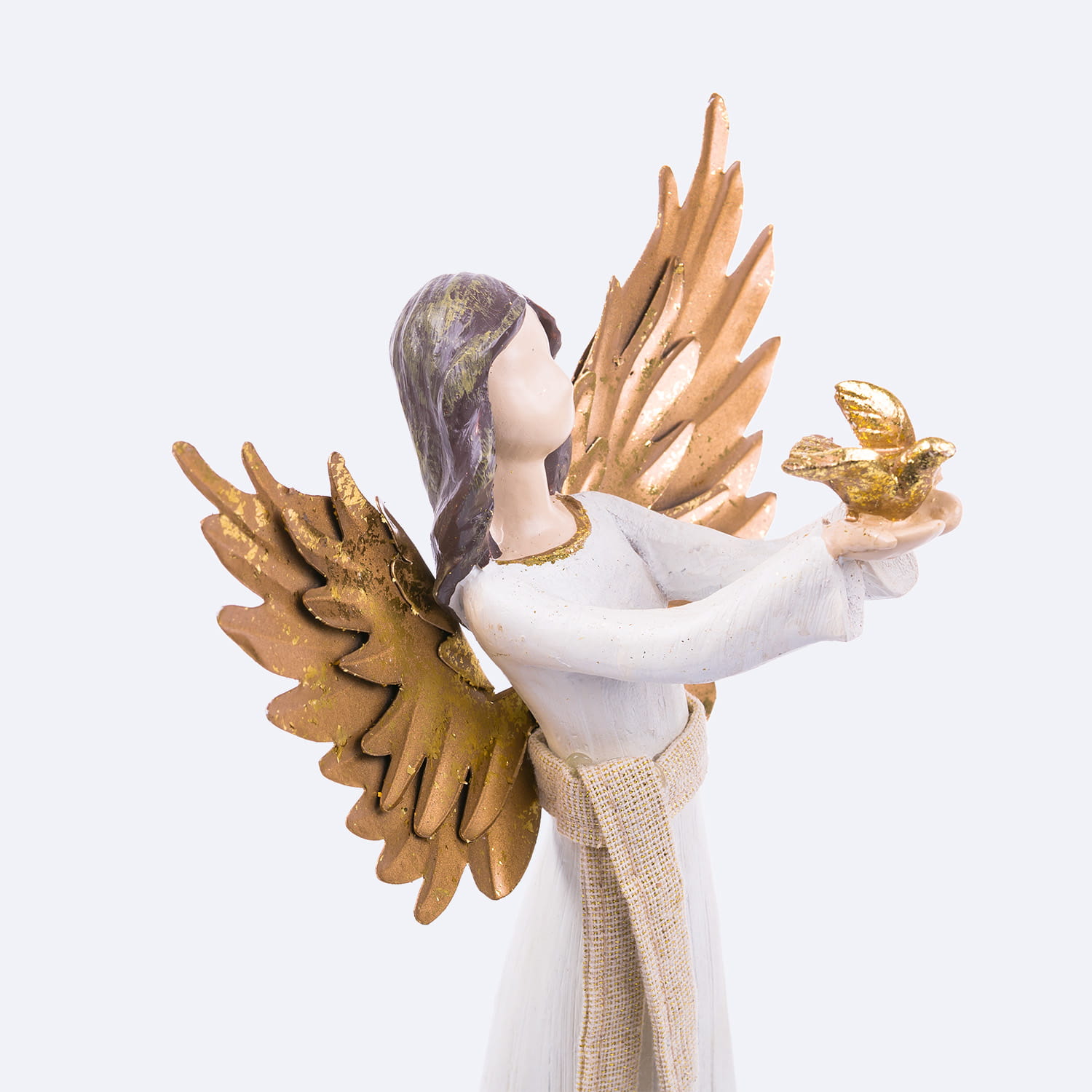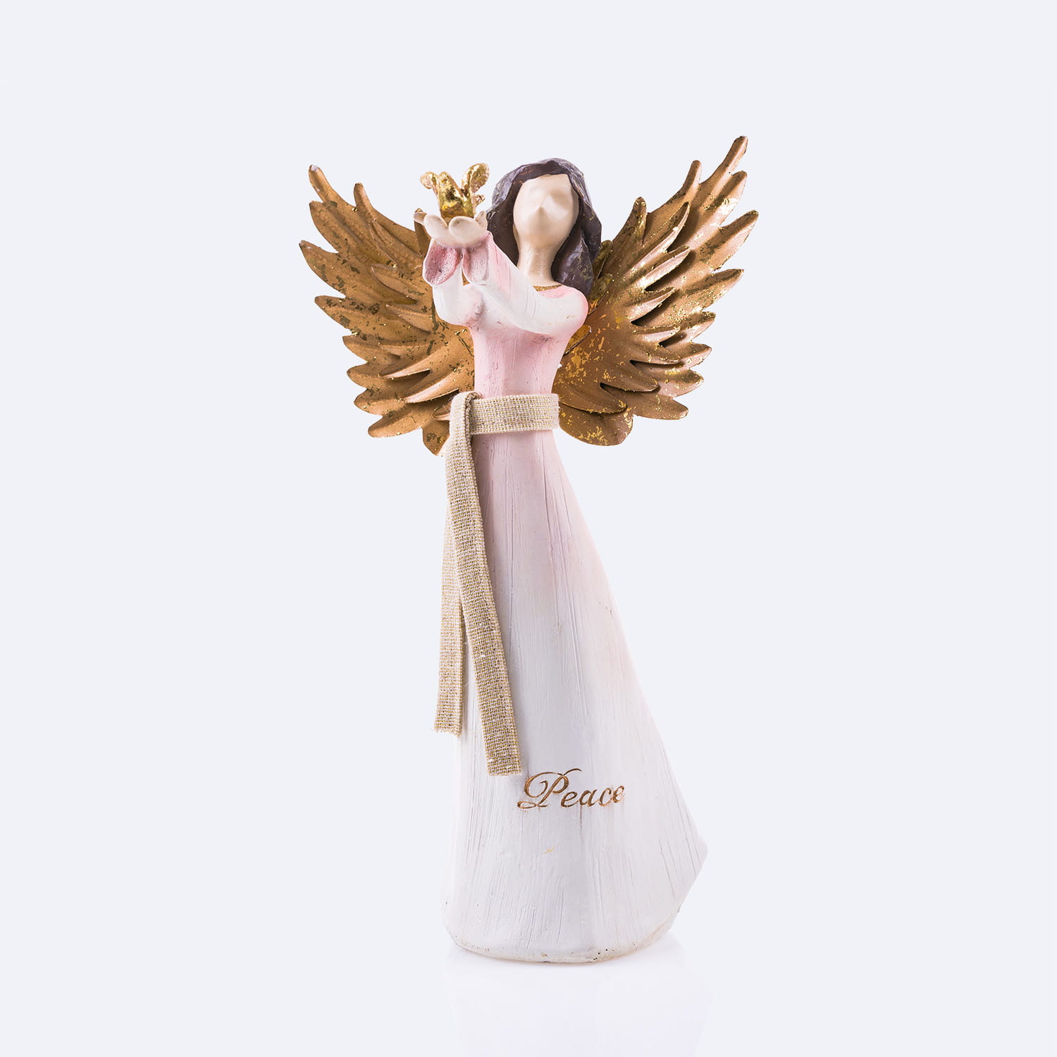 Anioł z gołębiem z napisem na sukni- hope (nadzieja). Skrzydełka anioła wykonane są z metalu w kolorze złotym. Figura malowana jest ręcznie.