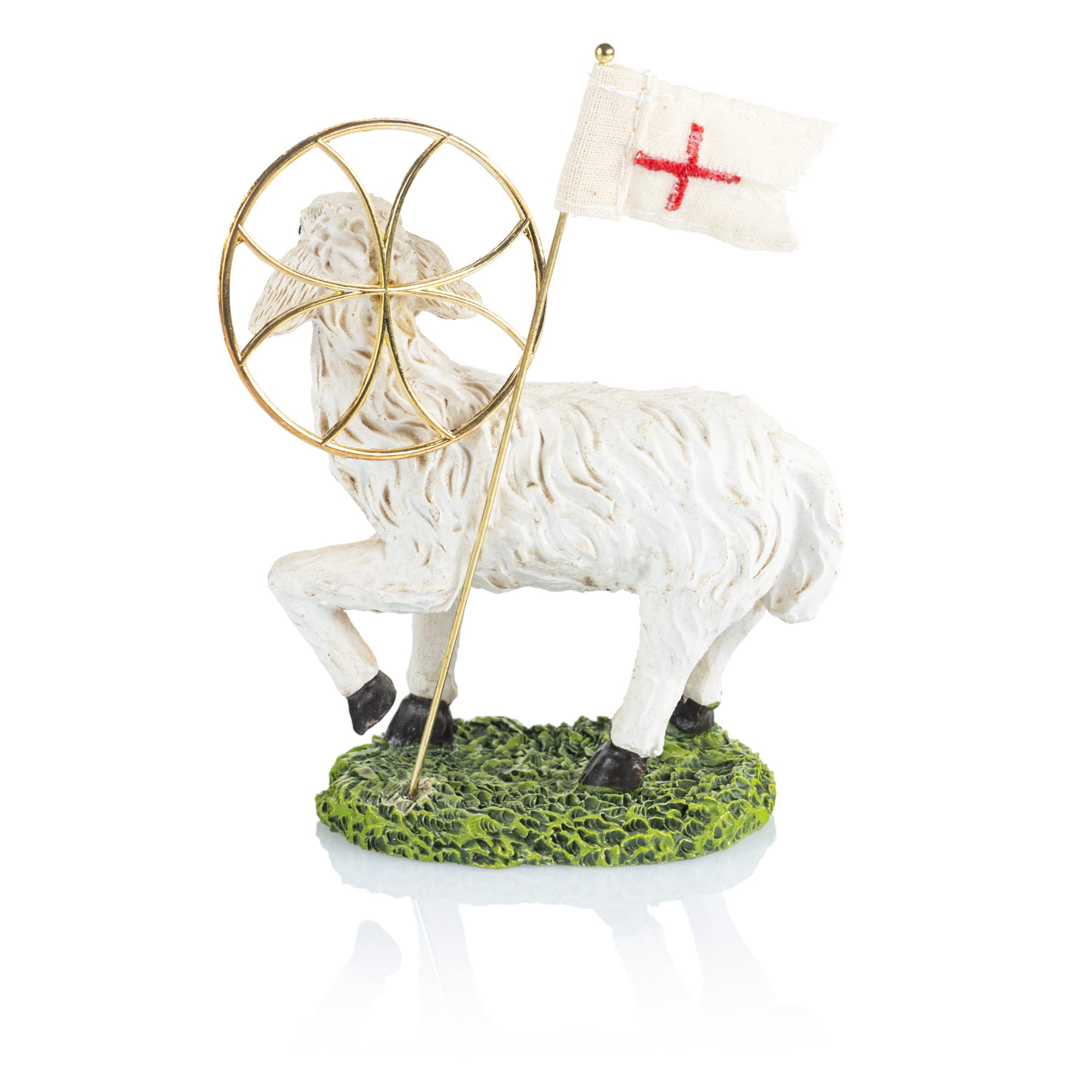 Na metalowym drzewcu baranek dzierży dumnie flagę, na której znajduje się symbol zwycięstwa nad złem. Detal ten dodaje głębi całej kompozycji, ukazując znaczenie wielkanocnego przesłania.