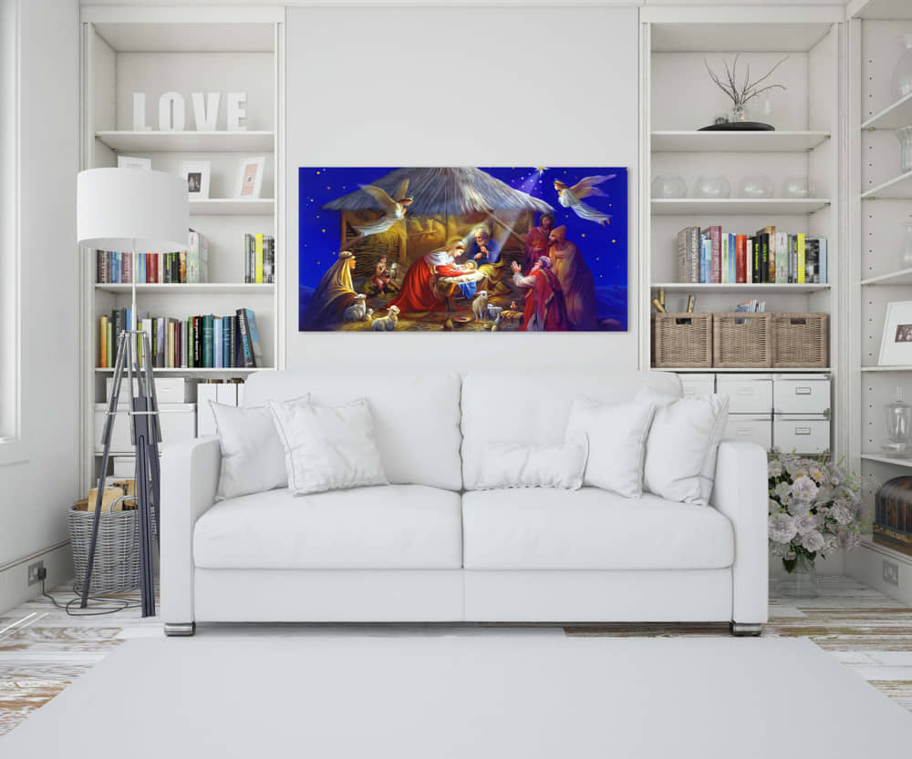 Obraz religijny na płótnie typu canvas przedstawiający scenę Bożego Narodzenia. Obraz z Bożym Narodzeniem może stanowić doskonały prezent, z pewnością wniesie do pomieszczenia ciepło i kolor a także może być pomocą w codziennej modlitwie.