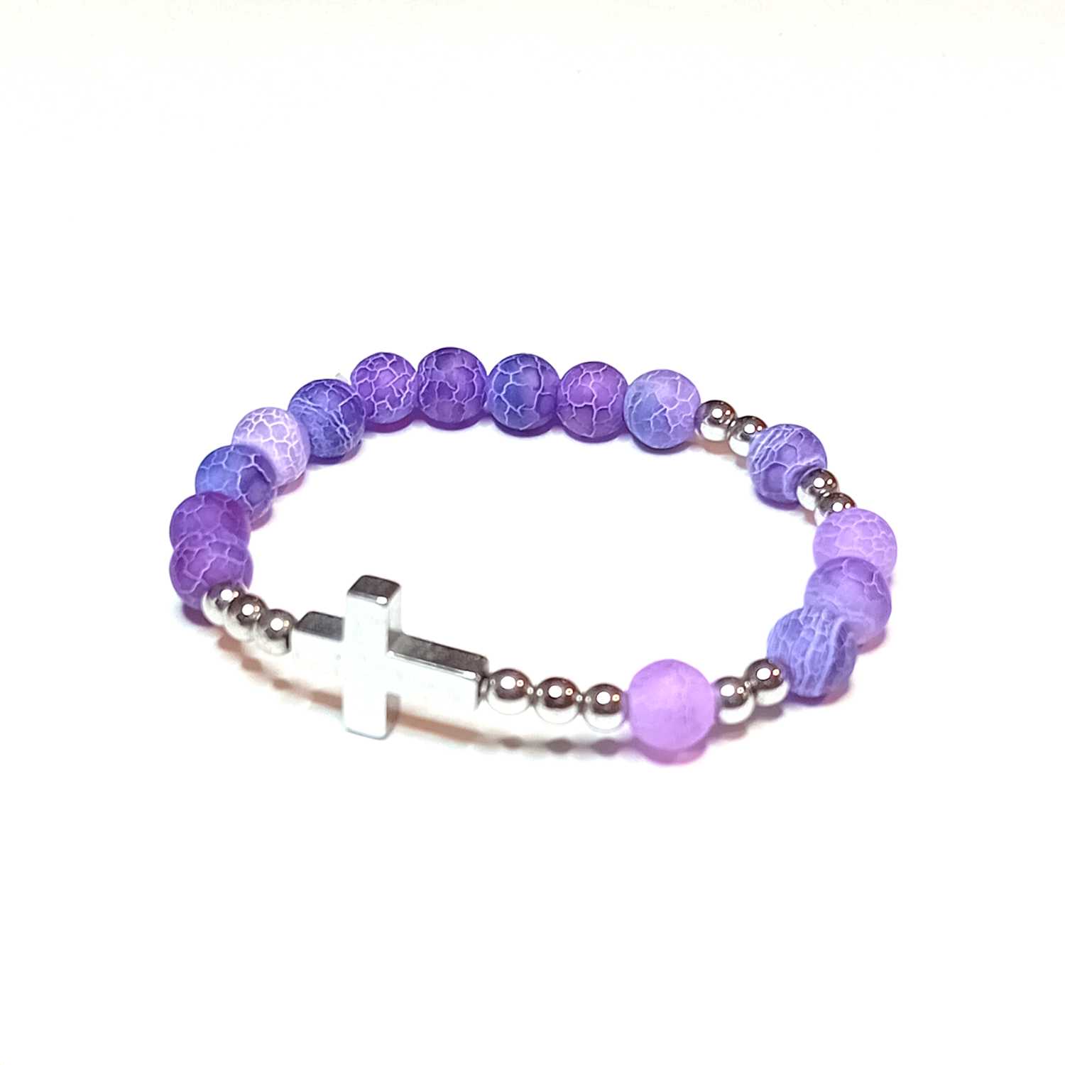 Bransoletka dziesiątka różańca na rękę wykonana jest z koralików z kamienia naturalnego - Agat mrożony fioletowy. Krzyżyk to także kamień naturalny - Hematyt. Koraliki nanizane są na gumkę jubilerską, która w swojej strukturze zawiera wiele włókien co nadaje jej wytrzymałości i elastyczności i sprawia że ta bransoletka - dziesiątka różańca jest uniwersalna do różnych obwodów nadgarstka.
