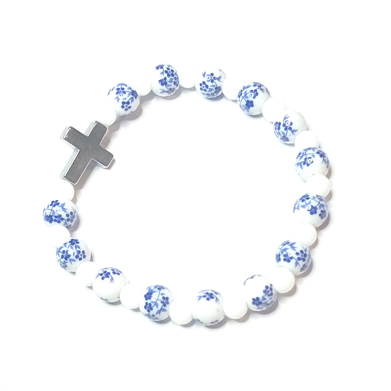 a ręcznie wykonana bransoletka łączy w sobie piękno naturalnych materiałów z duchowym przesłaniem. Składa się z delikatnych ceramicznych koralików, uzupełnionych o kamień naturalny – kwarc różowy, oraz hematytowy krzyżyk, który stanowi centralny element kompozycji.