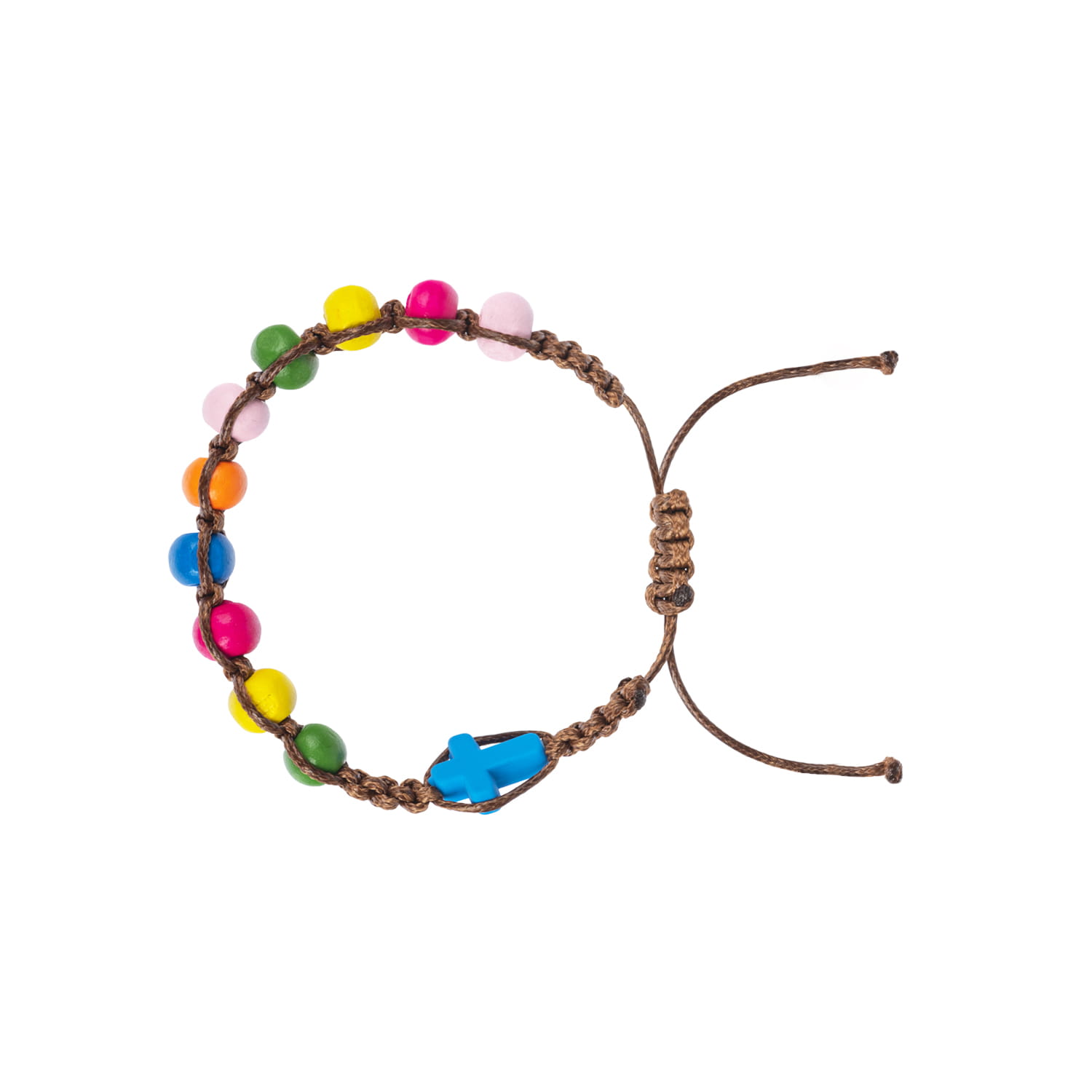 Bransoletka dziesiątek różańca dla dziecka. Koraliki w różnych kolorach wykonane z drewna i zaplecione w sznurek jubilerski. Bransoletka posiada długość regulacji.
