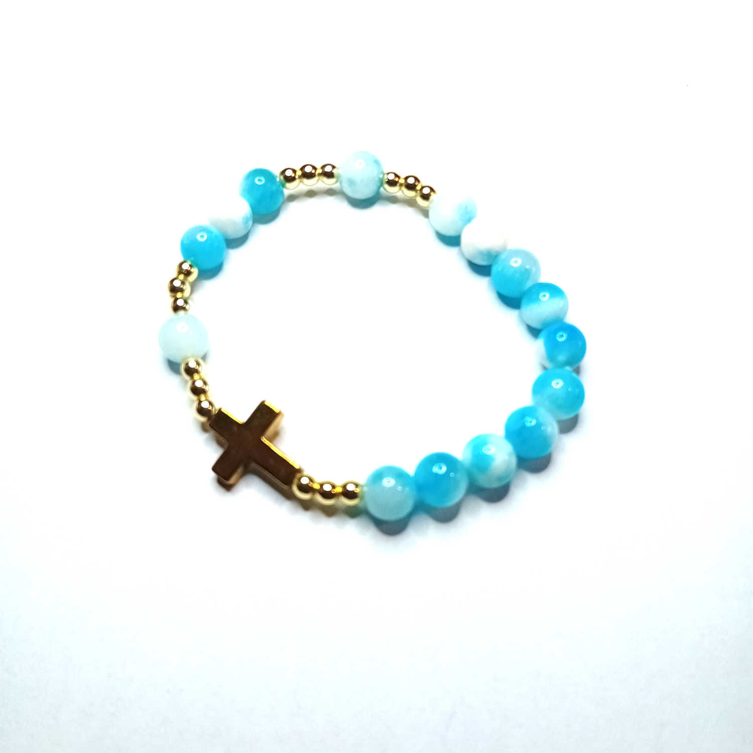 Krzyżyk ze złotego hematytu, umieszczony na końcu bransoletki, przypomina o męce i ofierze Jezusa Chrystusa, będąc znakiem zbawienia i miłości, która ofiarowała życie dla ludzkości. Noszenie tej bransoletki nie tylko przypomina o modlitwie, ale także stanowi piękny symbol codziennego zbliżania się do Boga. To narzędzie, które wspiera modlitwę, dodaje poczucia ochrony i pokoju, a także przypomina o sile i nadziei, jaką daje nasza wiara w Chrystusa.