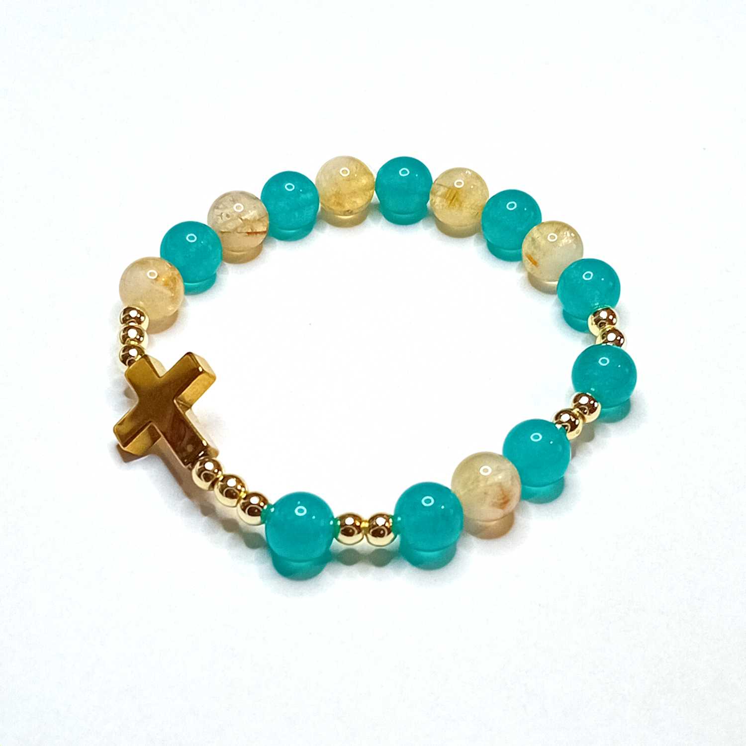 Dziesiątka różańca wykonana z zielonego chalcedonu, cytrynu oraz złotego hematytu to wyjątkowa bransoletka łącząca piękno natury z głębią duchowego znaczenia. Zielone koraliki chalcedonu przywodzą na myśl pokój i harmonię, natomiast promienny cytryn symbolizuje radość i światło. Złoty hematyt dodaje subtelnego blasku oraz stabilności. Bransoletka jest wzbogacona delikatnym złotym krzyżykiem, który podkreśla jej religijną symbolikę i doskonale nadaje się jako praktyczne narzędzie modlitwy.