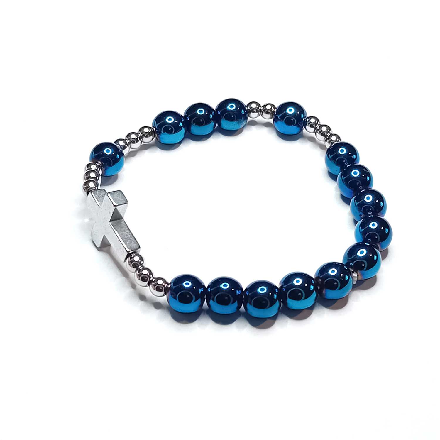 Hematyt granatowy – Granatowy hematyt symbolizuje spokój, wyciszenie oraz wewnętrzną głębię. W chrześcijańskiej symbolice może przypominać o tajemnicach wiary i głębokiej więzi z Bogiem, którą można pogłębiać w modlitwie. Granatowy kolor, nawiązujący do nieba, może również przywoływać myśli o nadziei i obietnicy życia wiecznego. Hematyt pomaga zachować koncentrację i stabilność, co sprzyja skupieniu podczas rozważań różańcowych.