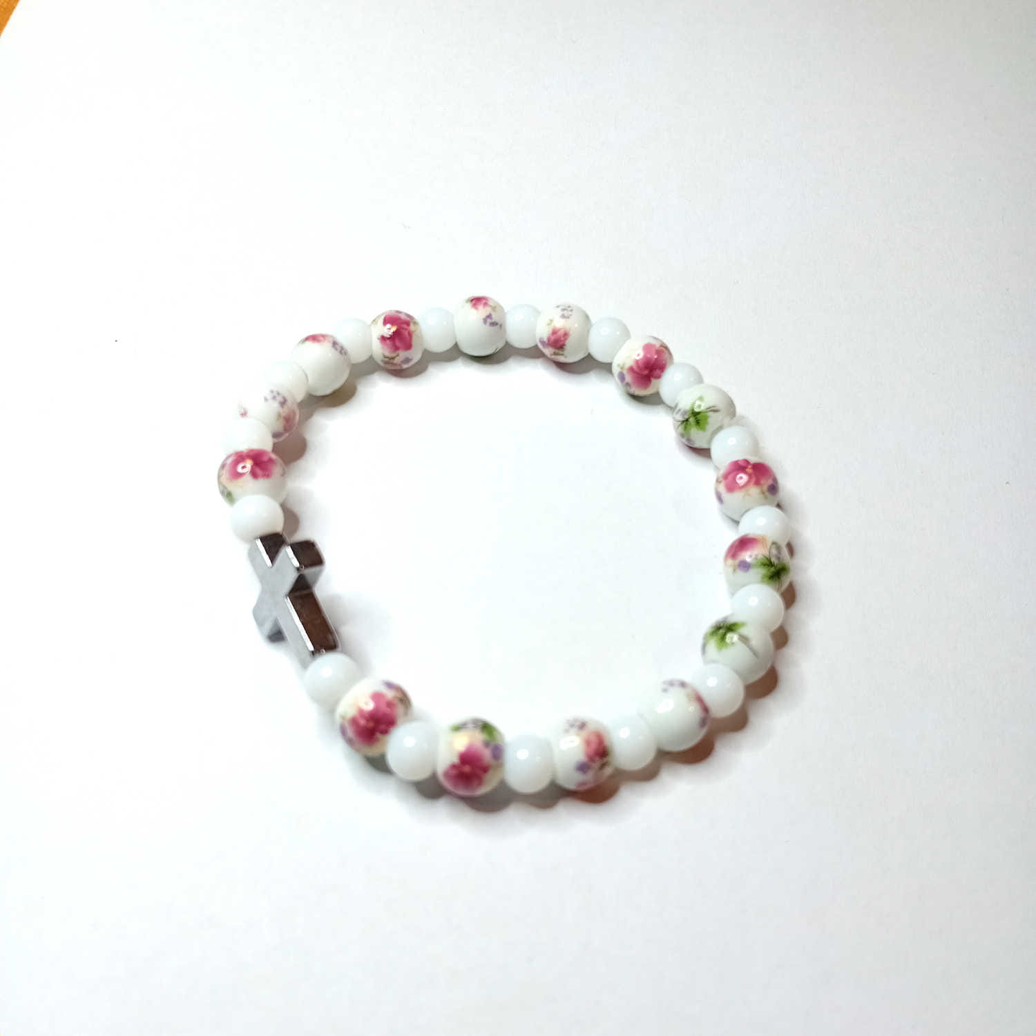Piękna i symboliczna bransoletka wykonana z białych ceramicznych koralików, ozdobionych ręcznie malowanymi kwiatuszkami, które przywodzą na myśl czystość duszy i piękno Bożego stworzenia. Centralnym elementem kompozycji jest naturalny kamień agat, znany z wyjątkowych, delikatnych wzorów, a całość dopełnia krzyżyk wykonany z hematytu – prosty, a zarazem głęboko znaczący symbol wiary.