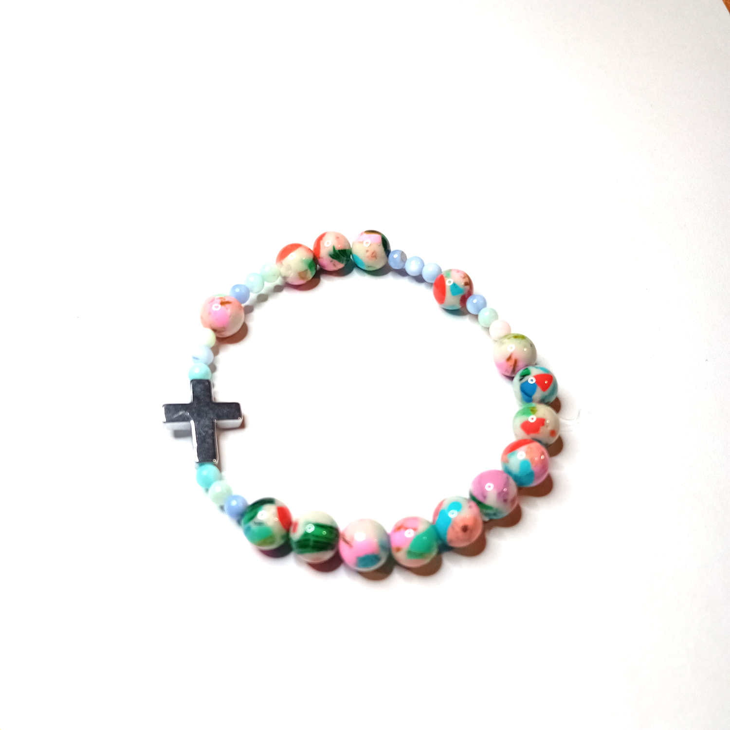 a ręcznie wykonana bransoletka łączy w sobie piękno naturalnych materiałów z duchowym przesłaniem. Składa się z delikatnych ceramicznych koralików, uzupełnionych o kamień naturalny – kwarc różowy, oraz hematytowy krzyżyk, który stanowi centralny element kompozycji.