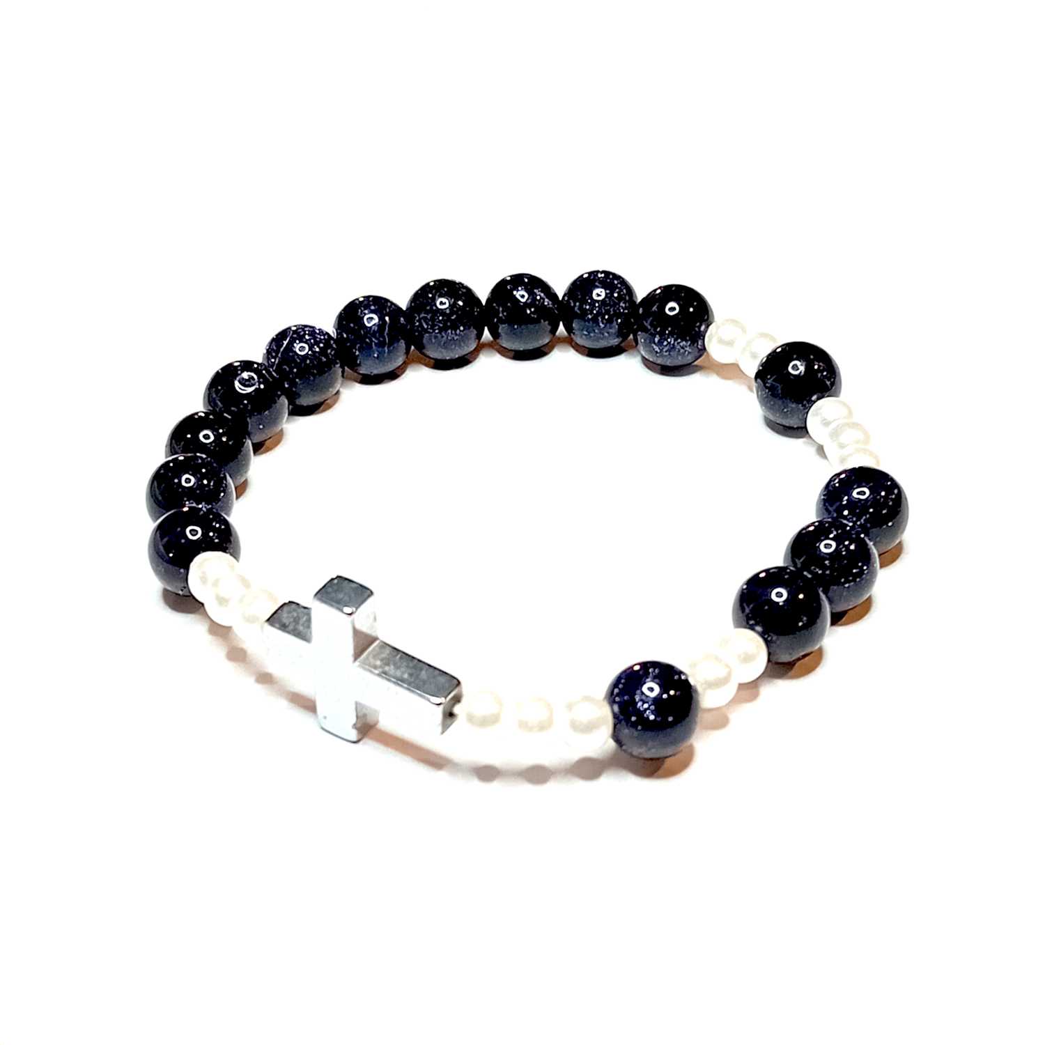a ręcznie wykonana bransoletka łączy w sobie piękno naturalnych materiałów z duchowym przesłaniem. Składa się z delikatnych ceramicznych koralików, uzupełnionych o kamień naturalny – kwarc różowy, oraz hematytowy krzyżyk, który stanowi centralny element kompozycji.
