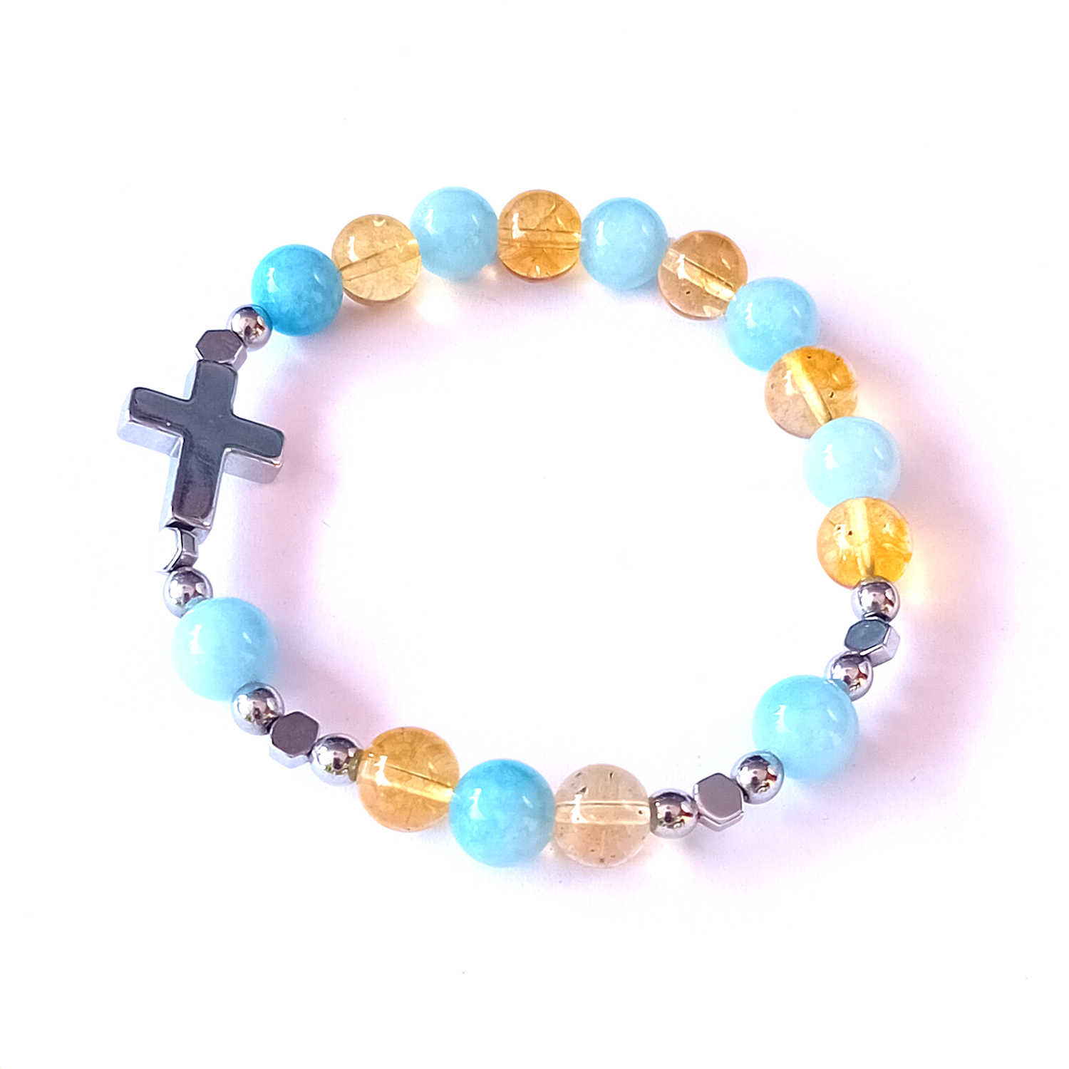 Delikatna i elegancka bransoletka wykonana z naturalnych kamieni półszlachetnych – akwamarynu i cytrynu. Starannie nawleczona na elastyczną, wytrzymałą żyłkę jubilerską, stanowi nie tylko wyjątkową ozdobę, ale i symbol duchowej harmonii oraz światła.