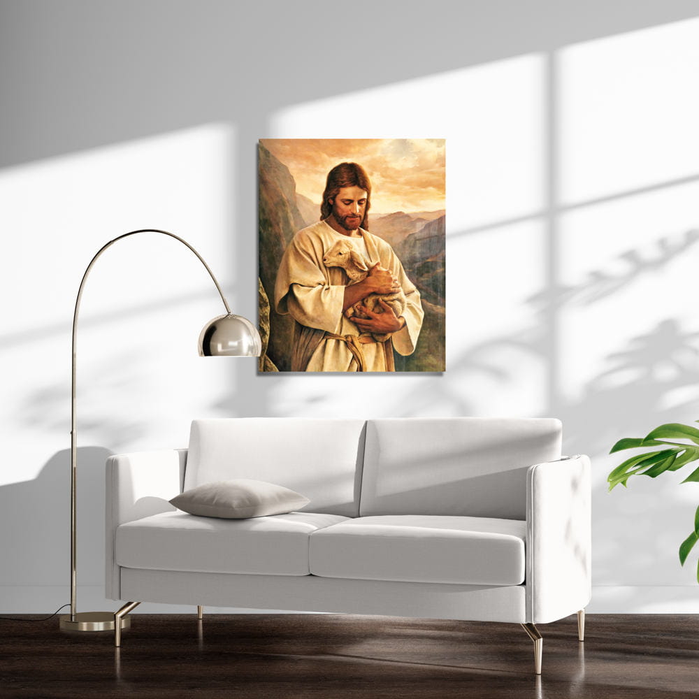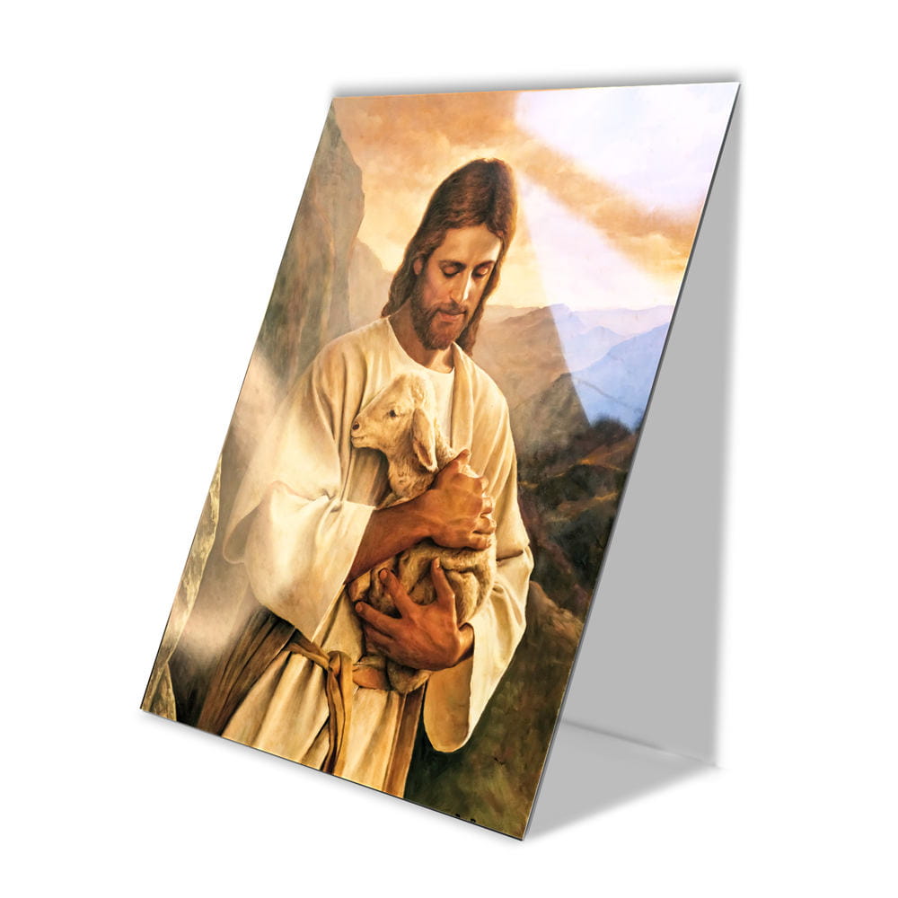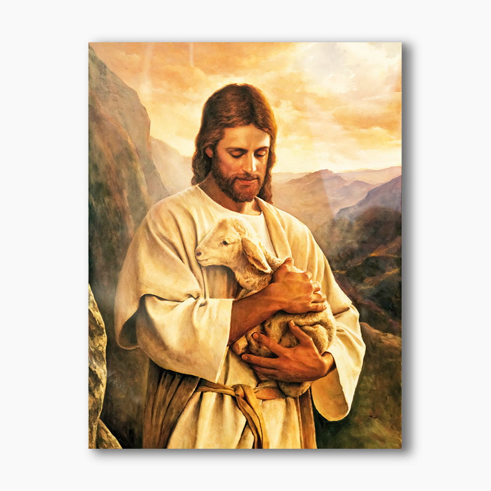 Obraz religijny przedstawiający Chrystusa Dobrego Pasterza z barankiem. Obraz wykonany na doskonałej jakości płycie plexi o wysokiej transparentności i zaskakująco żywych barwach. Dzięki użyciu plexi obraz posiada wrażenie trójwymiarowości.