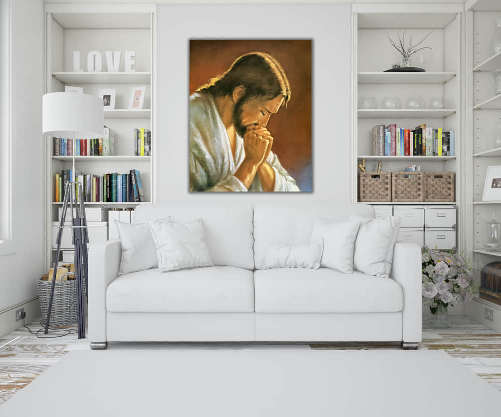 Obraz religijny na płótnie typu canvas przedstawiający obraz z wizerunkiem modlącego się Pana Jezusa. Obraz z wizerunkiem Jezusa Chrystusa może stanowić doskonały prezent, z pewnością wniesie do pomieszczenia ciepło i kolor a także może być pomocą w codziennej modlitwie.