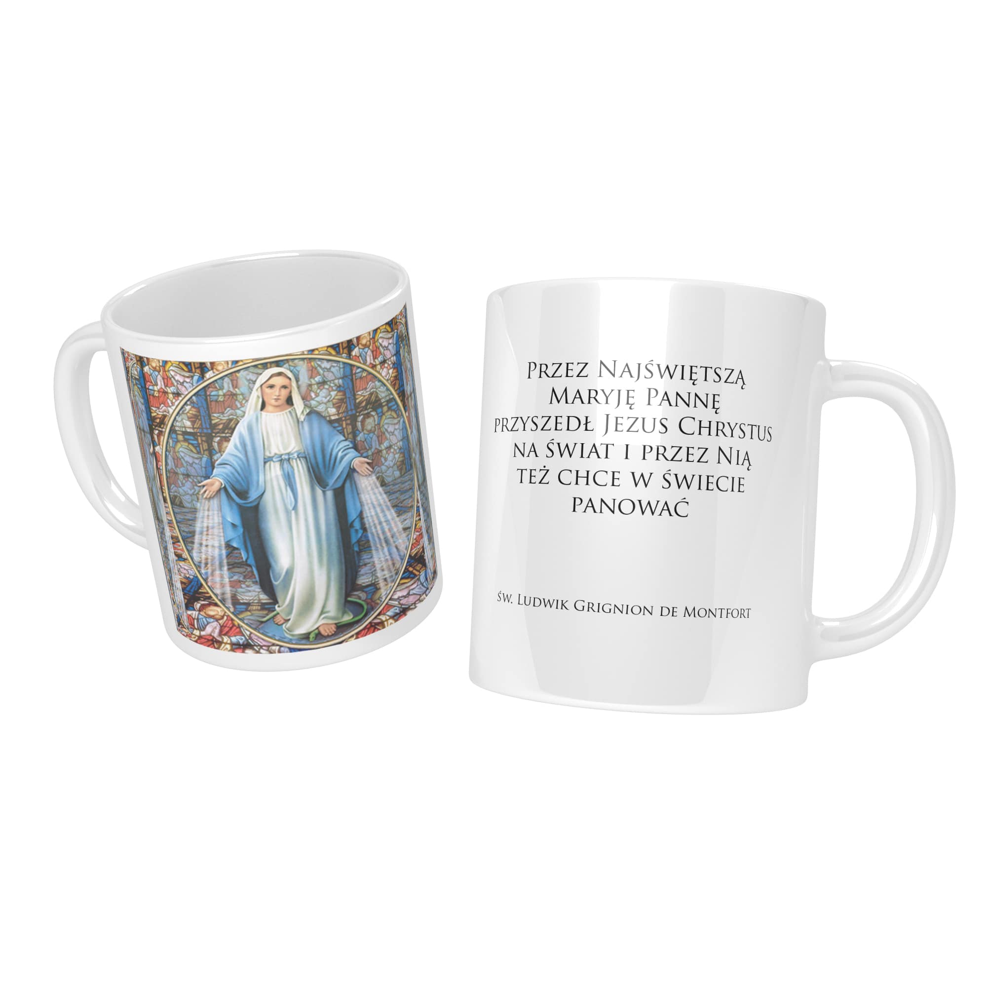 Biały kubek ceramiczny przedstawiający Matkę Bożą, o pojemności 330 ml. Najwyższej klasy ceramiczny kubek odporny na mycie w zmywarce z trwałym nadrukiem i nieblednącymi kolorami.