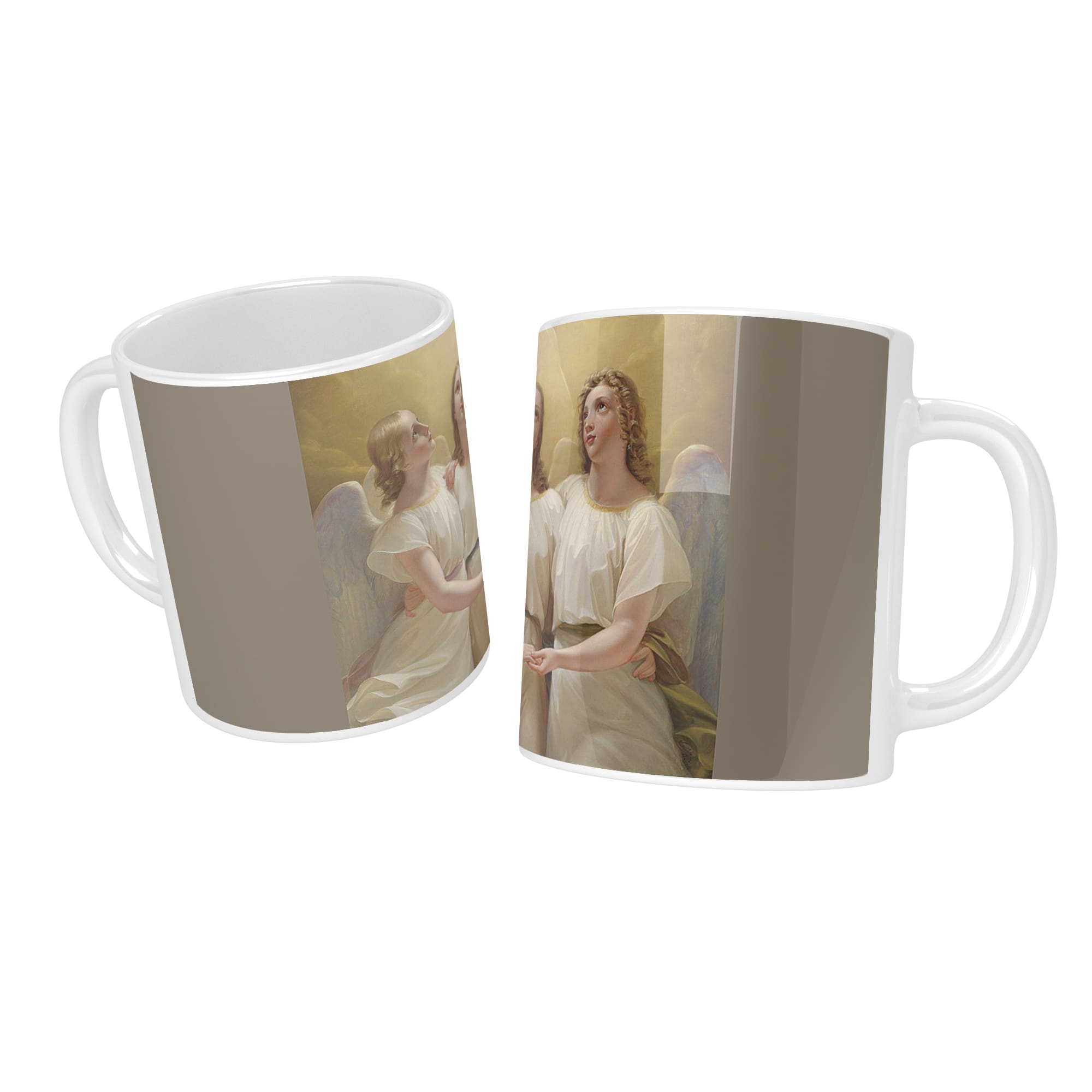 Biały kubek religijny przedstawiający obraz Anioła grającego na trąbie, o pojemności 330 ml. Najwyższej klasy ceramiczny kubek odporny na mycie w zmywarce z trwałym nadrukiem i nieblednącymi kolorami.