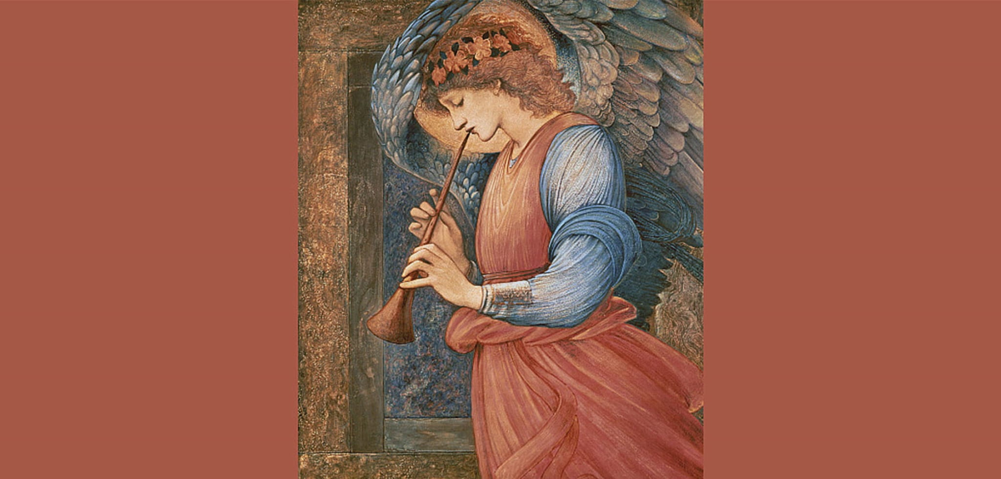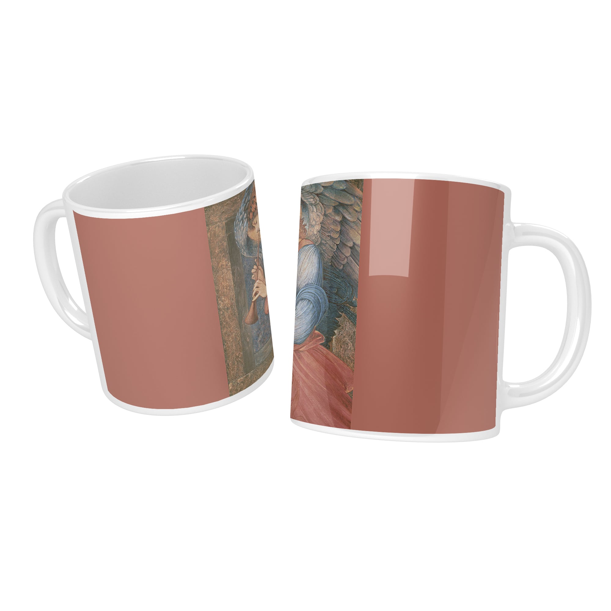 Biały kubek religijny przedstawiający obraz Anioła grającego na trąbie, o pojemności 330 ml.