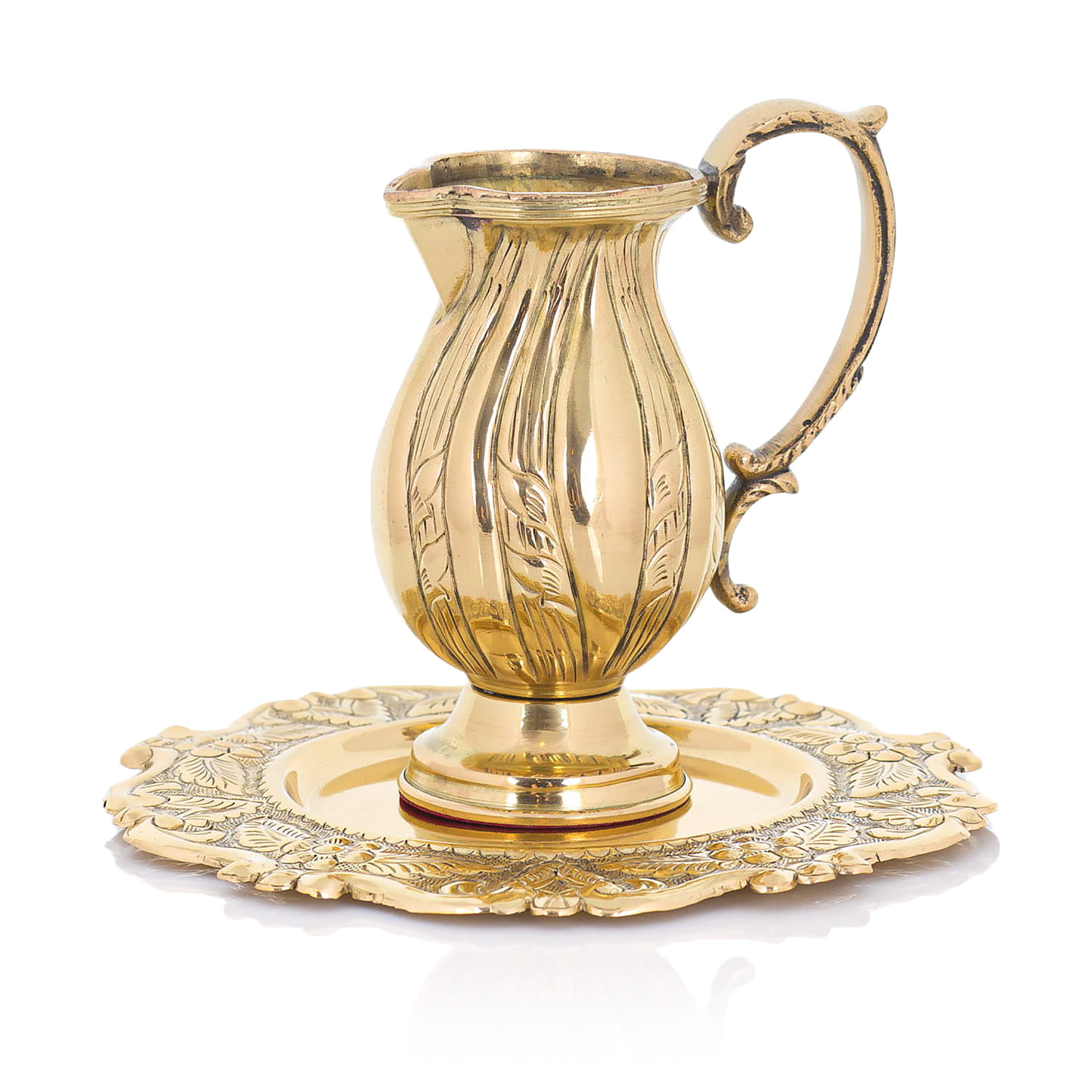 Dzbanek z uchwytem do Chrztu Świętego. Wykonany ze zdobionych odlewów mosiężnych. Dzbanek i taca wykończone na połysk i zabezpieczone proszkowym lakierem bezbarwnym.