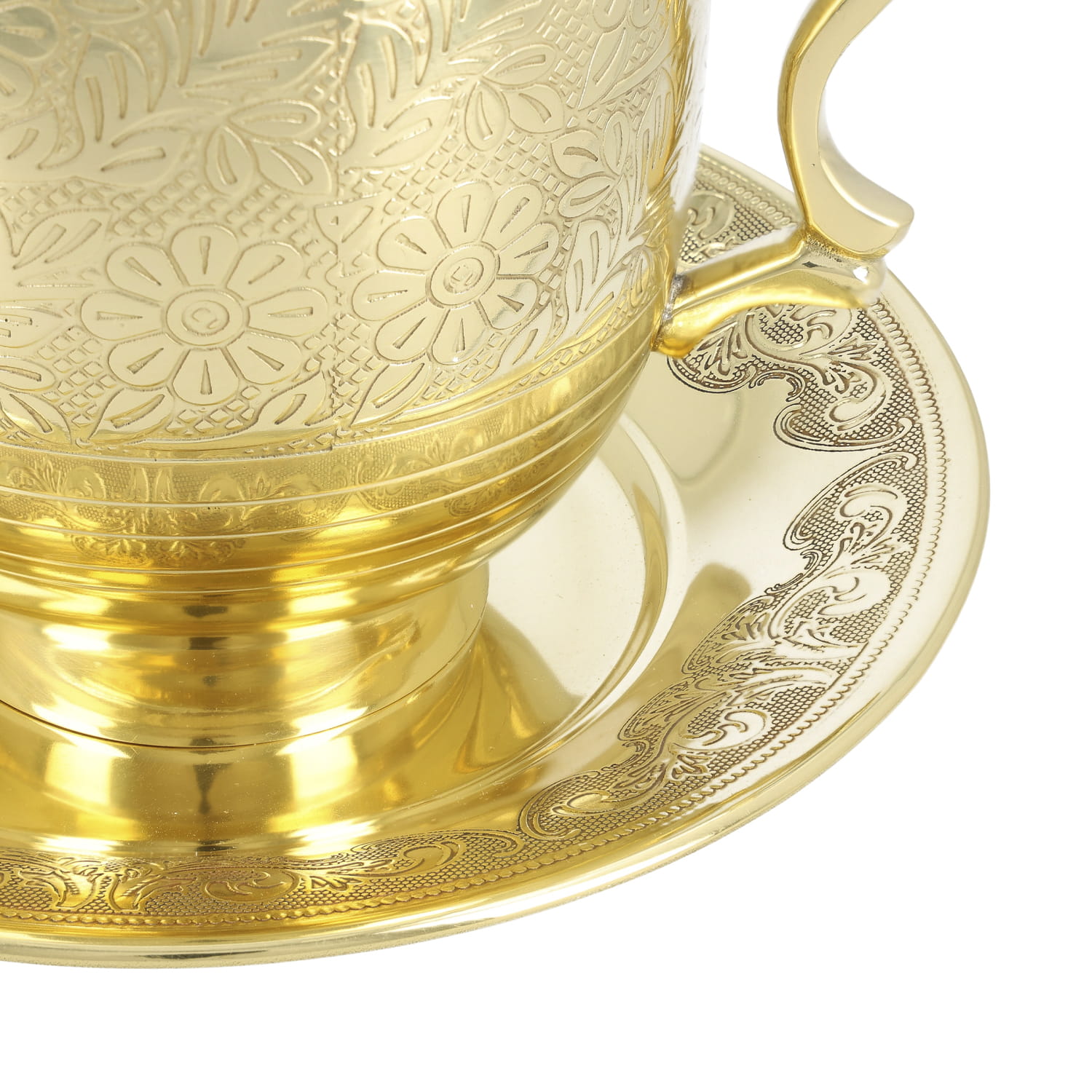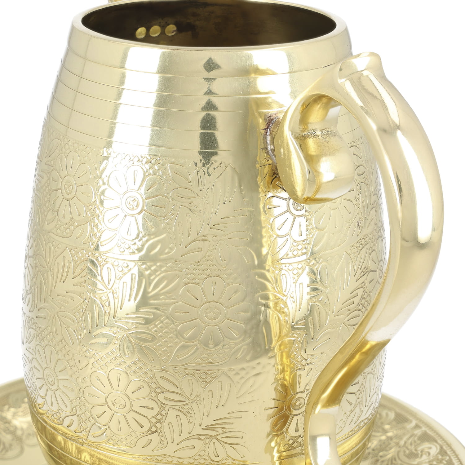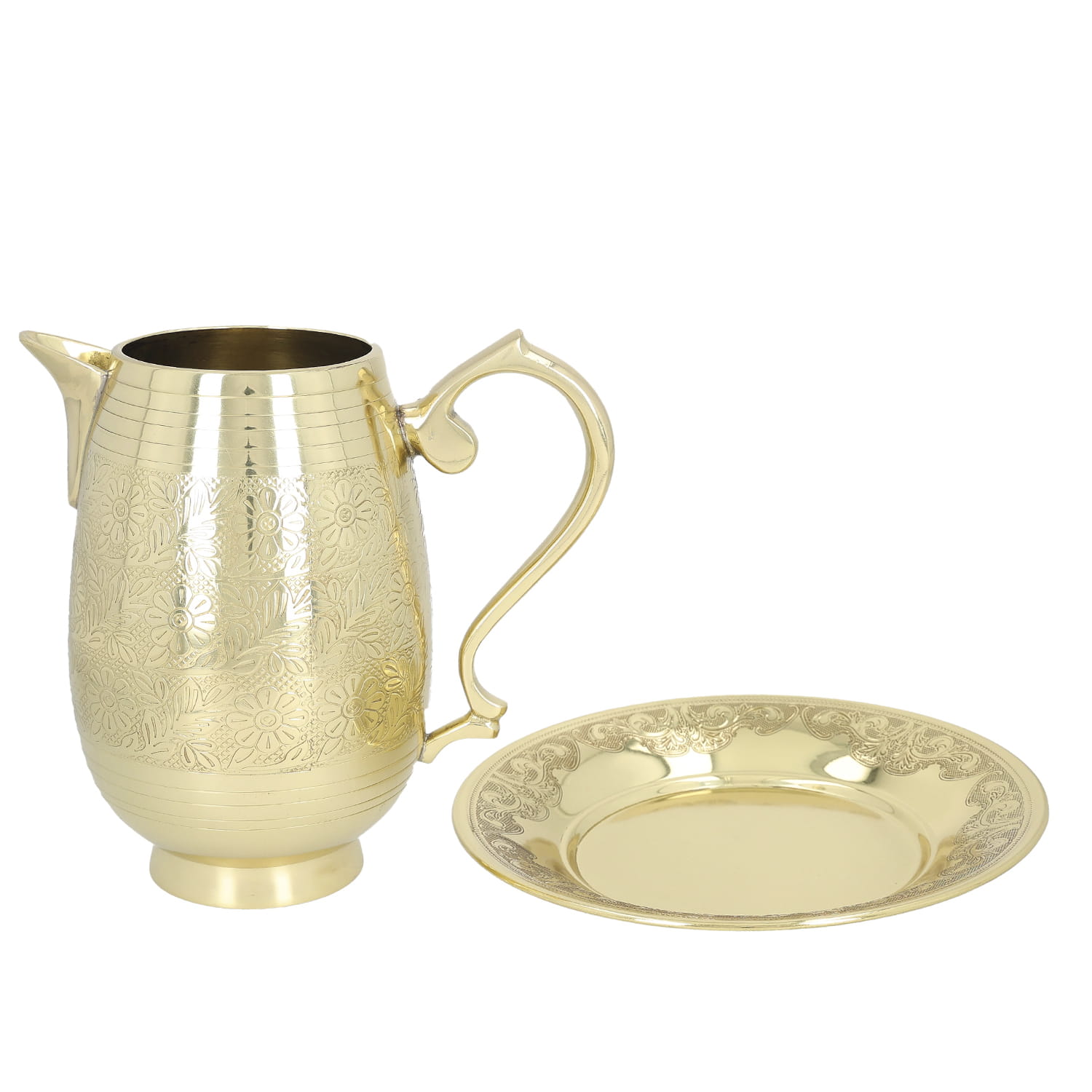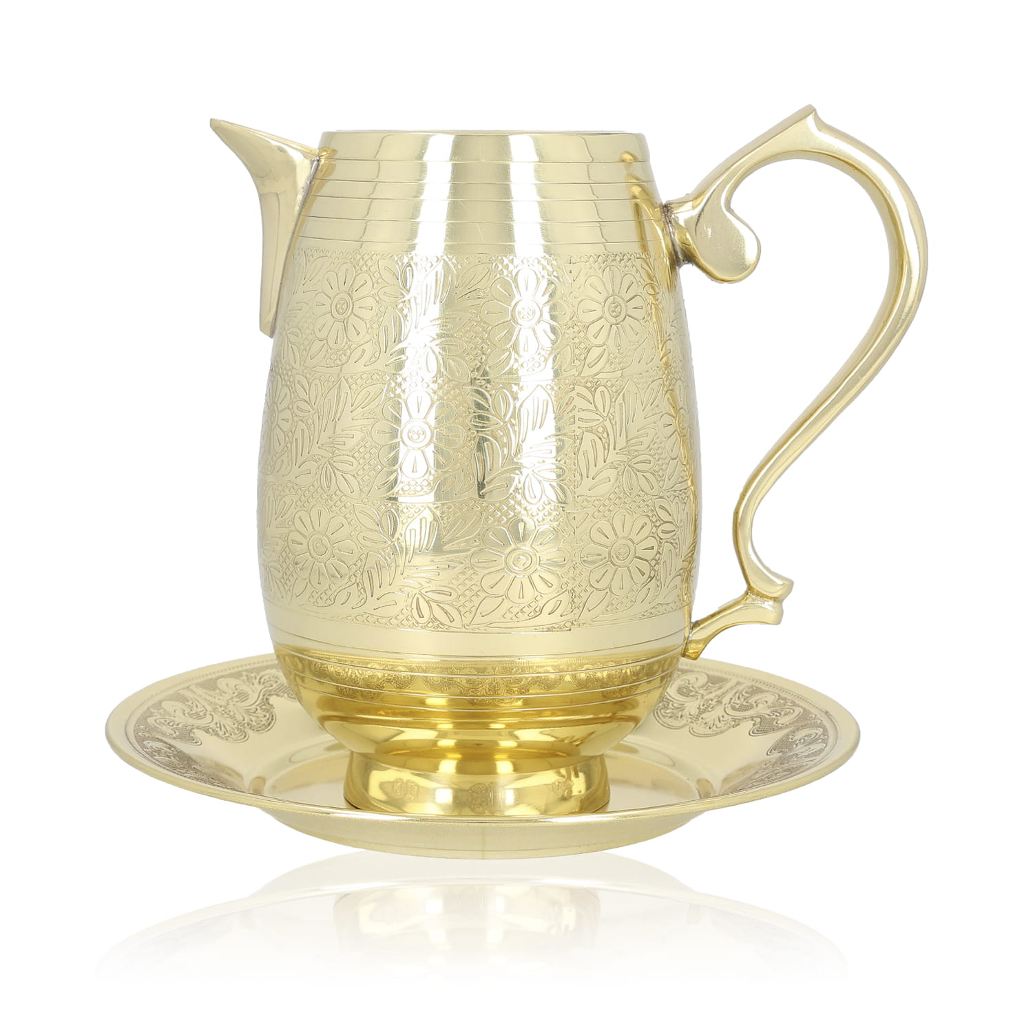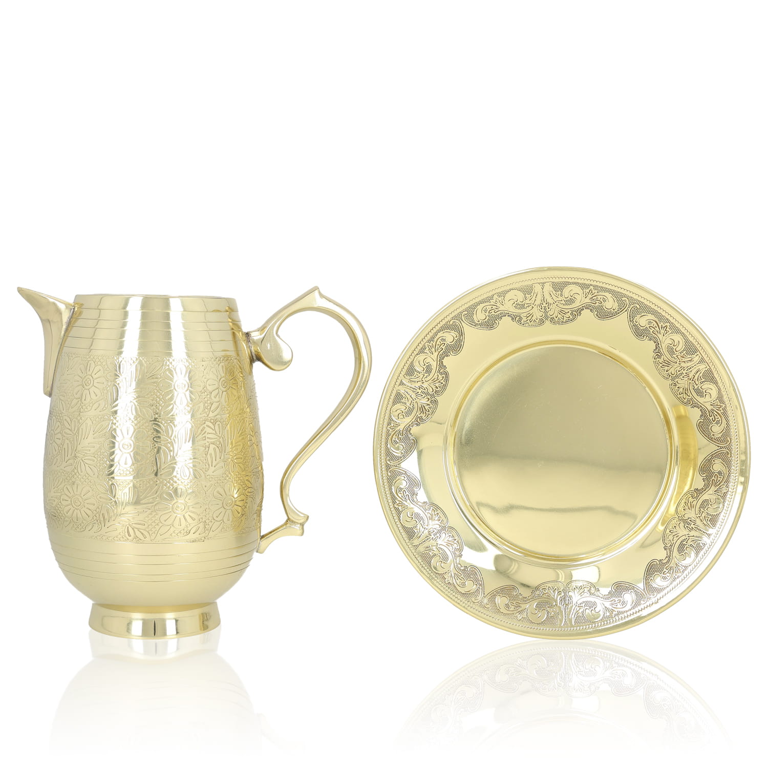 Dzbanek do Chrztu Świętego z tacą. Całość wykonana jest ze zdobionych odlewów mosiężnych. Dzbanek i taca wykończone na połysk i zabezpieczone proszkowym lakierem bezbarwnym.