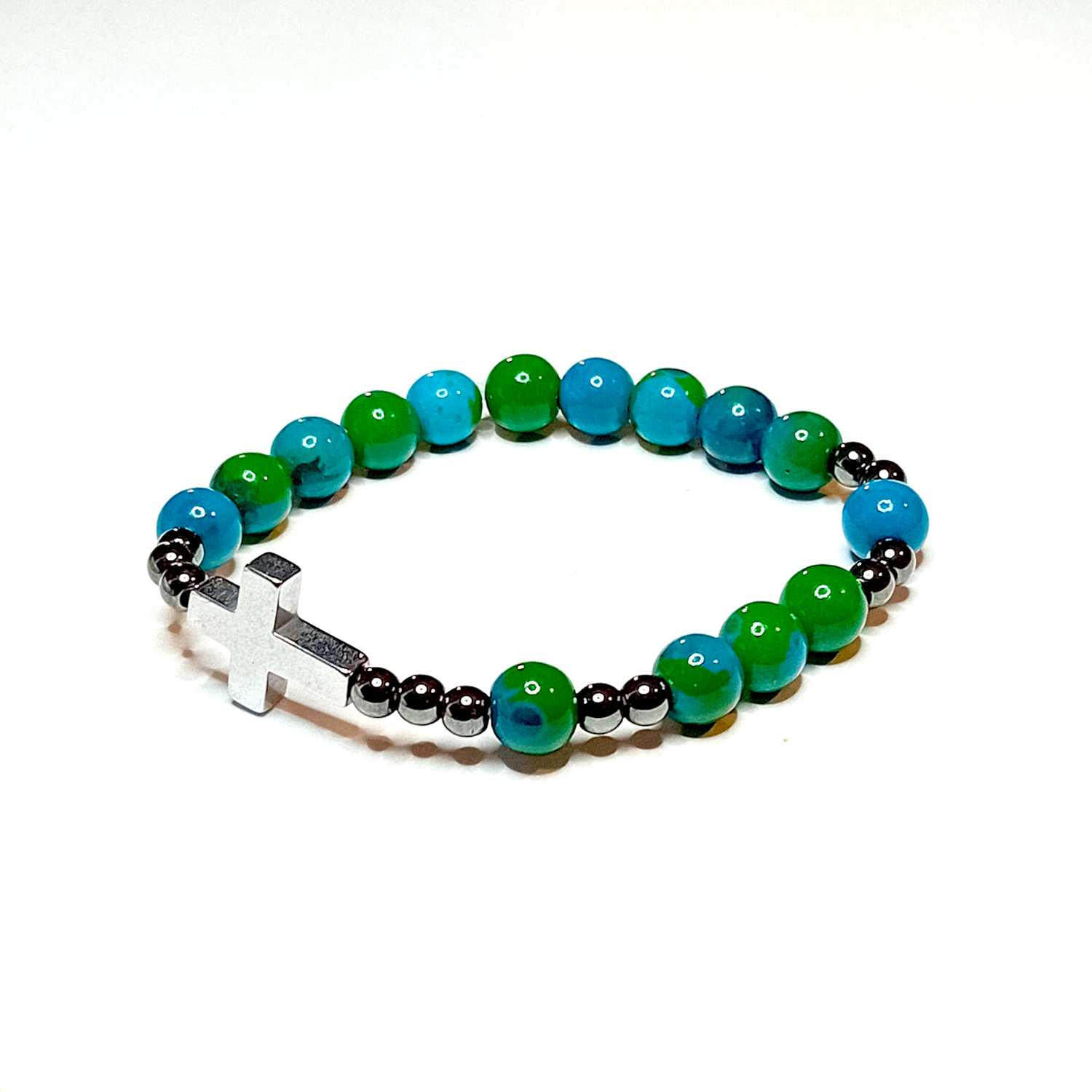 Bransoletka dziesiątka różańca na rękę wykonana jest z koralików z kamienia naturalnego - Chryzokola Okrągły Feniks. Krzyżyk to także kamień naturalny - Hematyt. Koraliki nanizane są na gumkę jubilerską, która w swojej strukturze zawiera wiele włókien co nadaje jej wytrzymałości i elastyczności i sprawia że ta bransoletka - dziesiątka różańca jest uniwersalna do różnych obwodów nadgarstka.