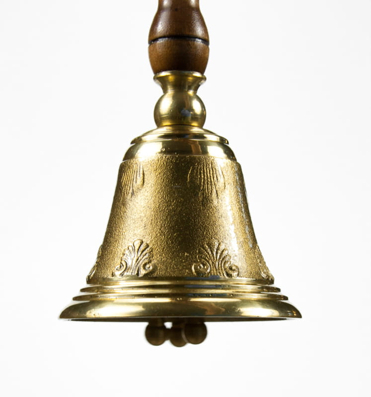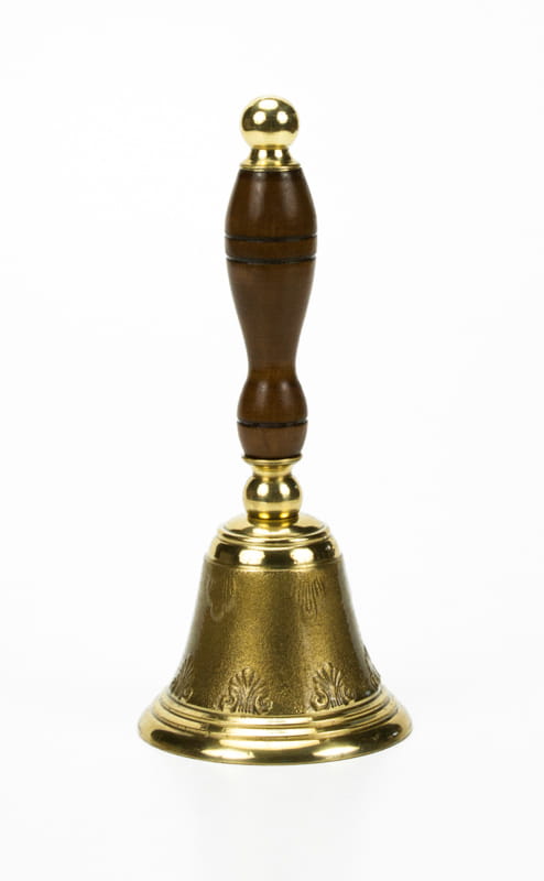 Mosiężny zdobiony dzwonek pojedynczy z drewnianą rączką. Sercem dzwonka są trzy kuleczki