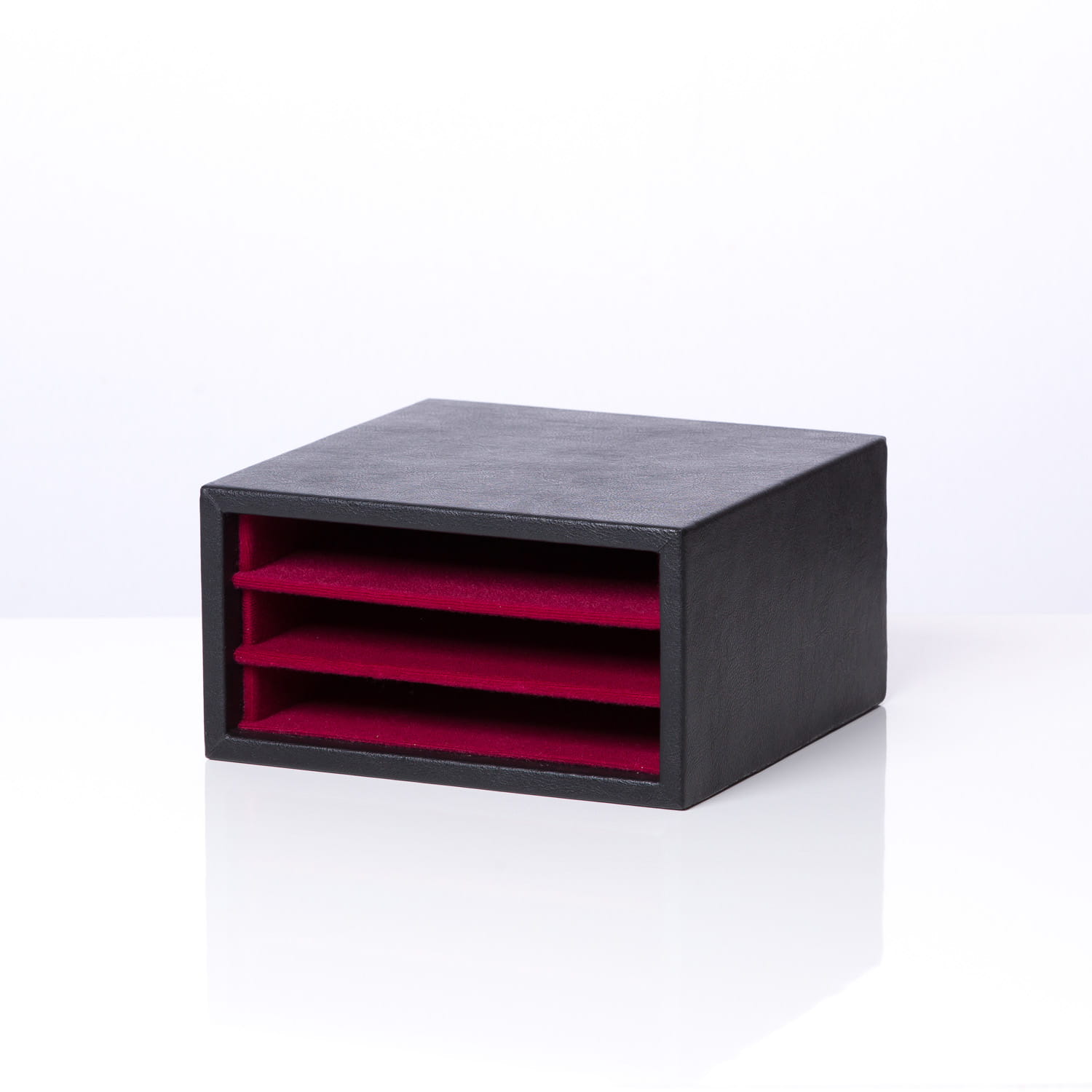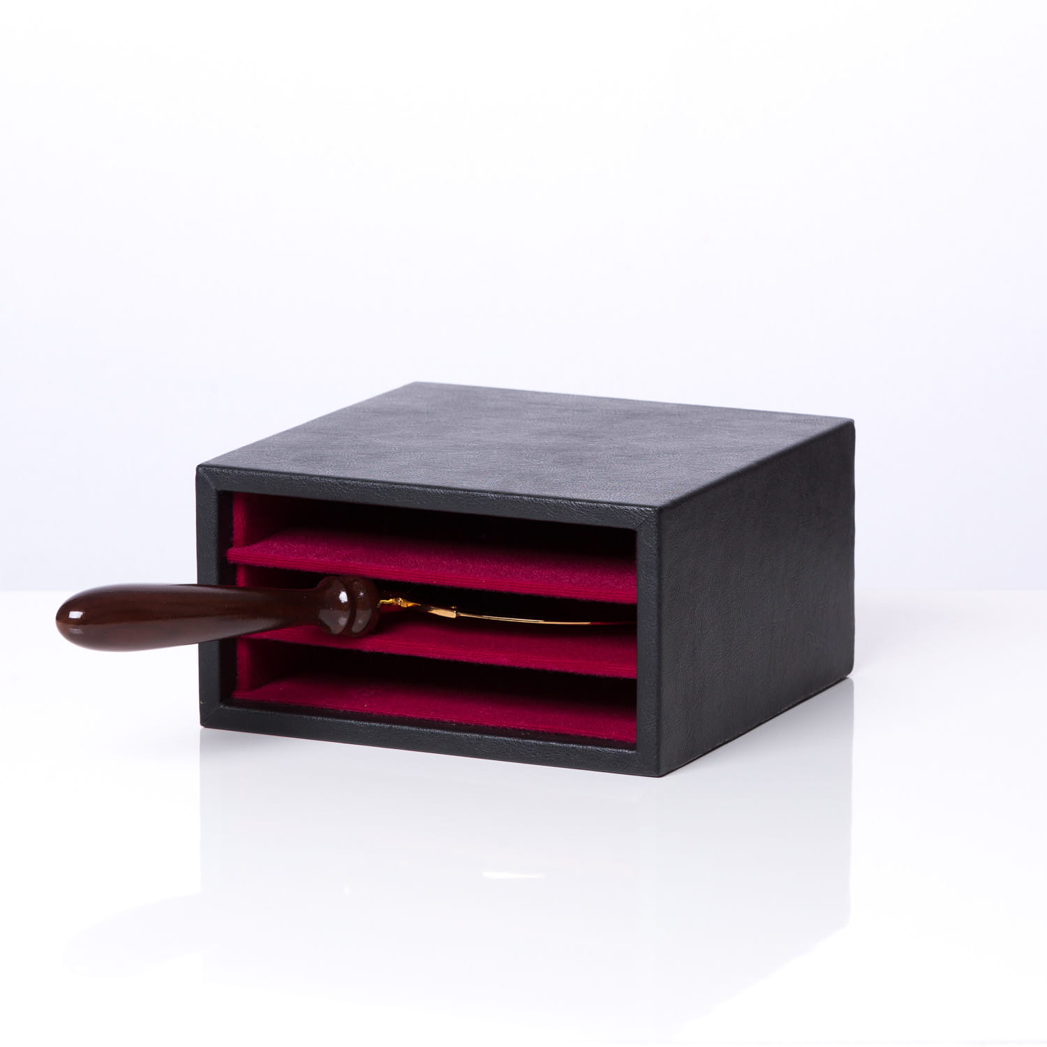 Etui na 3 pateny wykonane z drewna. Część wewnętrzna czyli półeczki etui na trzy pateny tapicerowane są materiałem w kolorze bordowym. Część zewnętrzna tapicerowana czarną sztuczną skórą.
