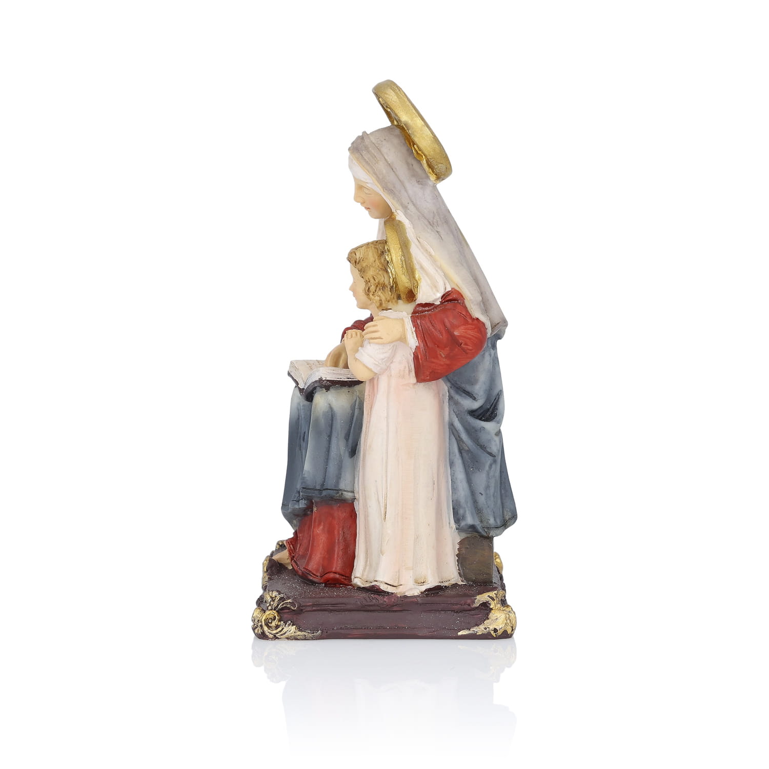 Ta piękna figura przedstawia Świętą Annę, matkę Maryi, w chwili pełnej czułości i mądrości, gdy przekazuje swojej córce pierwsze nauki wiary. To wyjątkowe przedstawienie ukazuje głęboką więź między matką a dzieckiem, a także duchowe dziedzictwo przekazywane z pokolenia na pokolenie.