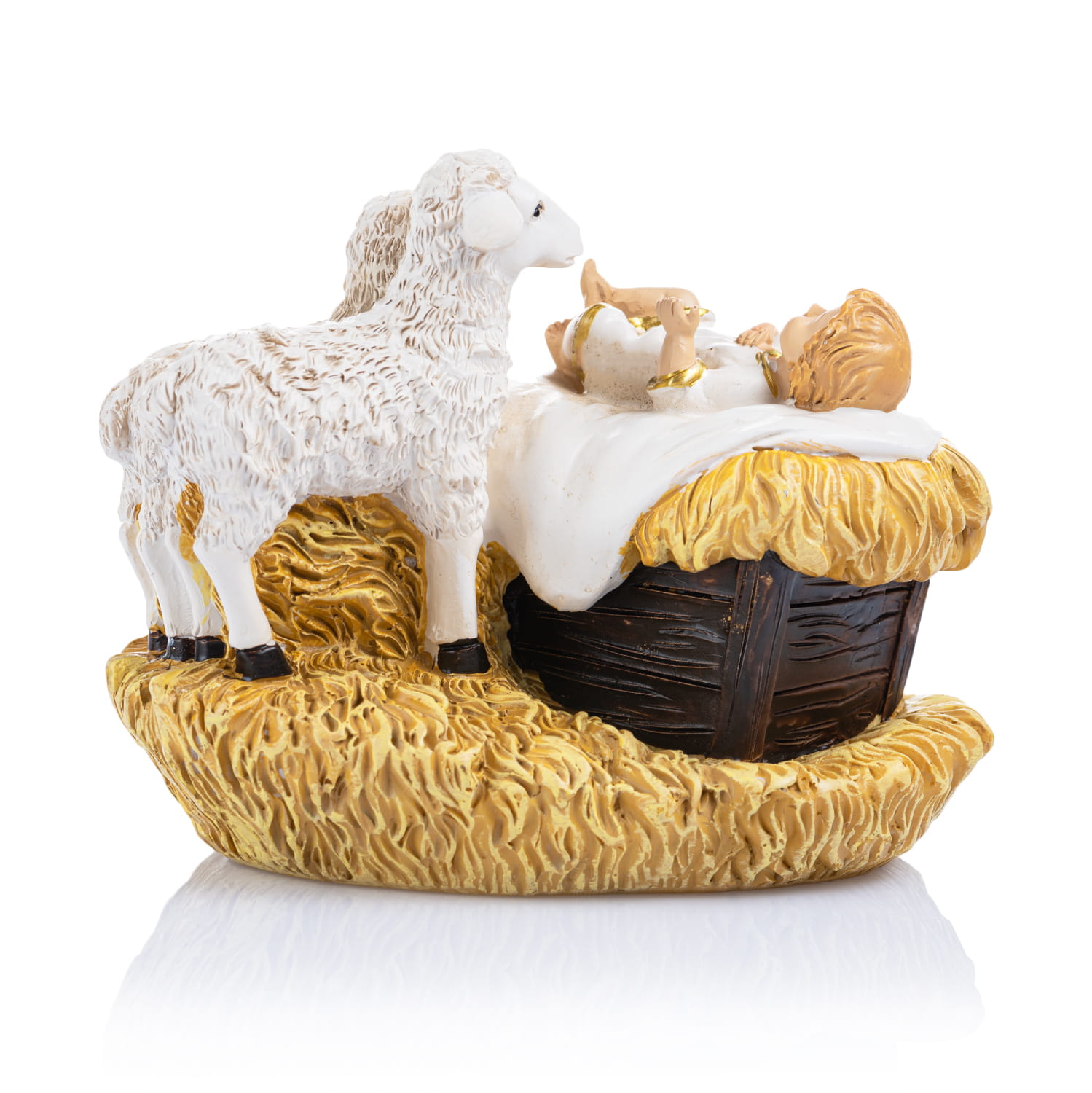 Jest to figurka Jezuska na sianku, wykonana z żywicy, która nadaje jej trwałość i wytrzymałość. Figurka została również malowana z dużą precyzją, co pozwala na ukazanie najdrobniejszych detalów. Na podstawie tej figurki widzimy Jezuska leżącego na sianku w towarzystwie dwóch owieczek. Owieczki przyglądają się Jezusowi z ciekawością i oddaniem, symbolizując tym samym wierność i bezpieczeństwo.