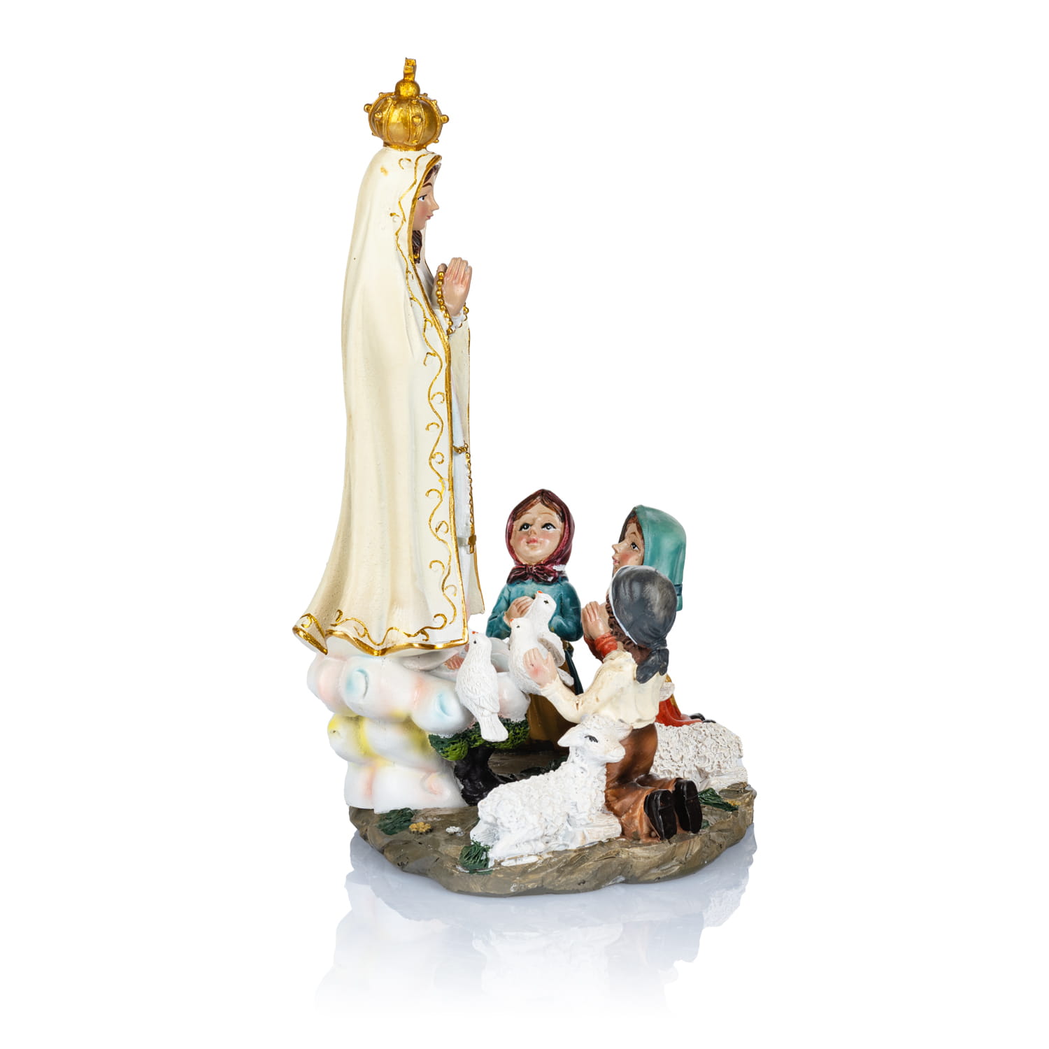 Figura przedstawia Matkę Bożą Fatimską podczas objawienia się trójce pastuszków: Hiacyncie, Franciszkowi i Łucji. Maryja ubrana jest w długą białą szatę, ozdobioną złotymi detalami, symbolizującą Jej czystość i niebiańskie pochodzenie. Na głowie Matki Bożej znajduje się złota korona, podkreślająca Jej królewski tytuł i szczególne miejsce w wierze katolickiej. Postawa Maryi z rękami złożonymi w modlitwie zachęca do duchowej refleksji i oddania się Bogu.