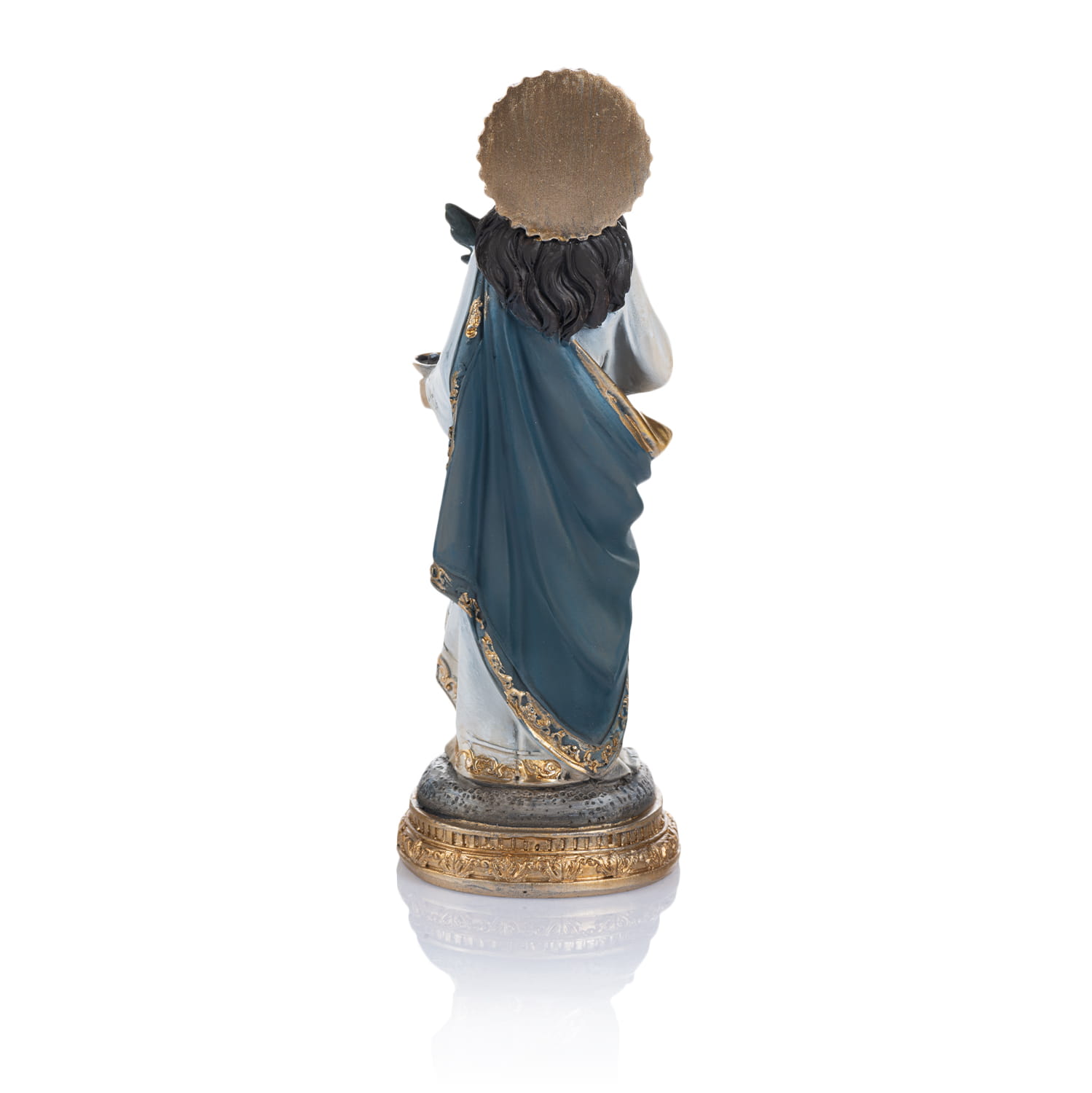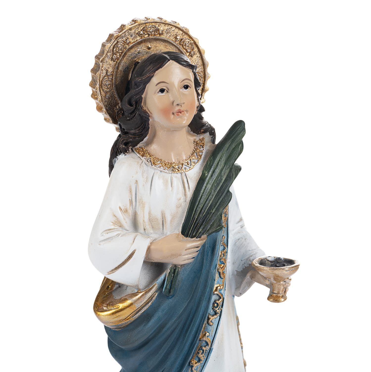 Figurka Świętej Łucji wykonana jest z wysokiej jakości żywicy, co pozwala na precyzyjne oddanie detali postaci. Ręcznie malowana, prezentuje się niezwykle realistycznie i jest odzwierciedleniem tradycyjnego wizerunku świętej.