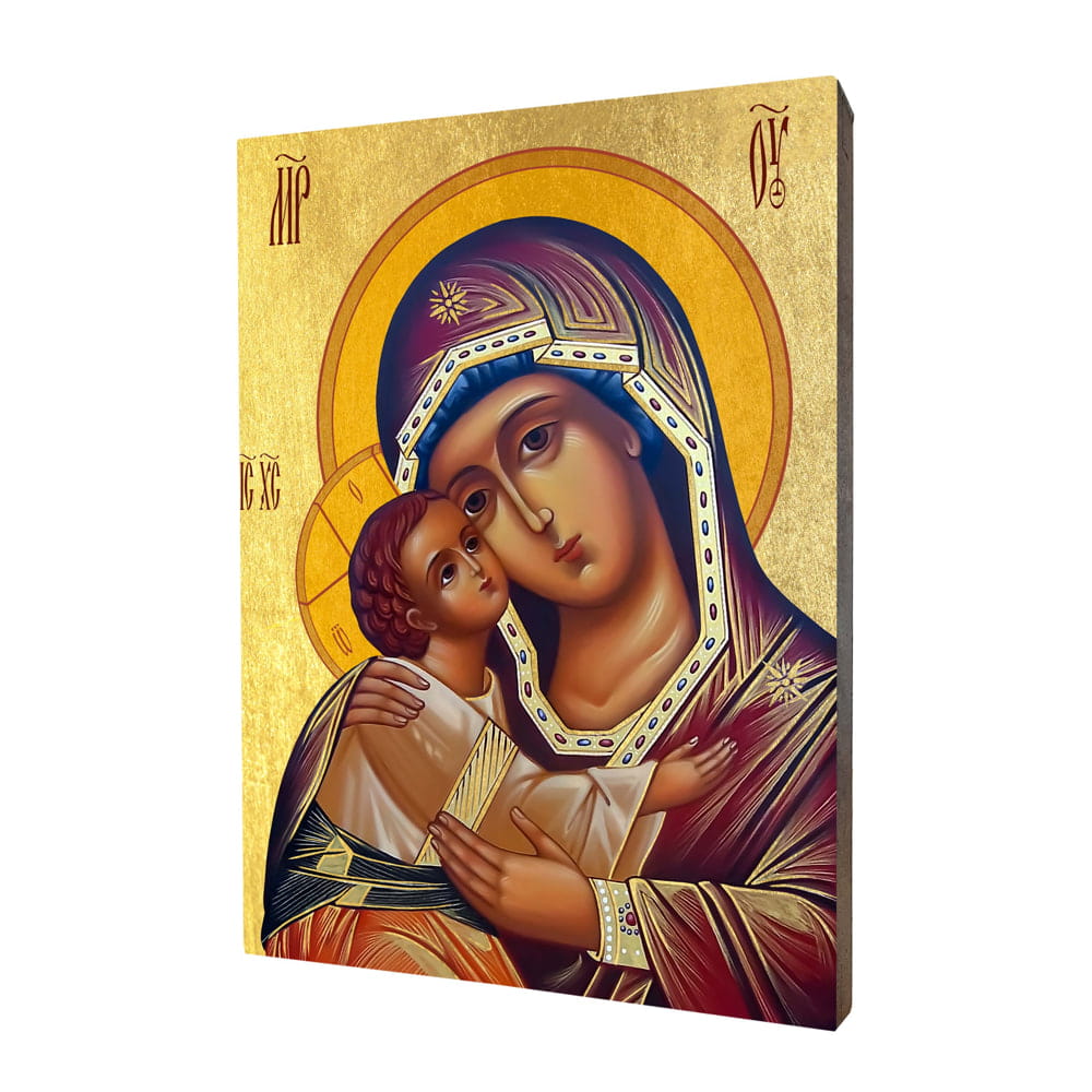 Ikona Matki Bożej Czułej wykonana na desce lipowej, podwójnie gruntowanej oraz uszlachetnionej płatkami pozłoty. Wizerunek Matki Boskiej został naniesiony przy użyciu specjalnej techniki druku bezpośrednio na deskę. Ikona z tyłu posiada certyfikat. Dzięki estetycznemu wykończeniu ikona z Matką Bożą może stanowić niezwykły upominek religijny na każdą okazję.