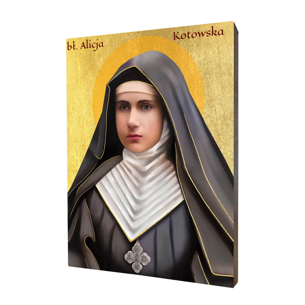 Ikona błogosławionej Alicji Kotowskiej wykonana na desce lipowej, podwójnie gruntowanej oraz uszlachetnionej płatkami pozłoty. Wizerunek błogosławionej Alicji Kotowskiej został naniesiony przy użyciu specjalnej techniki druku bezpośrednio na deskę.