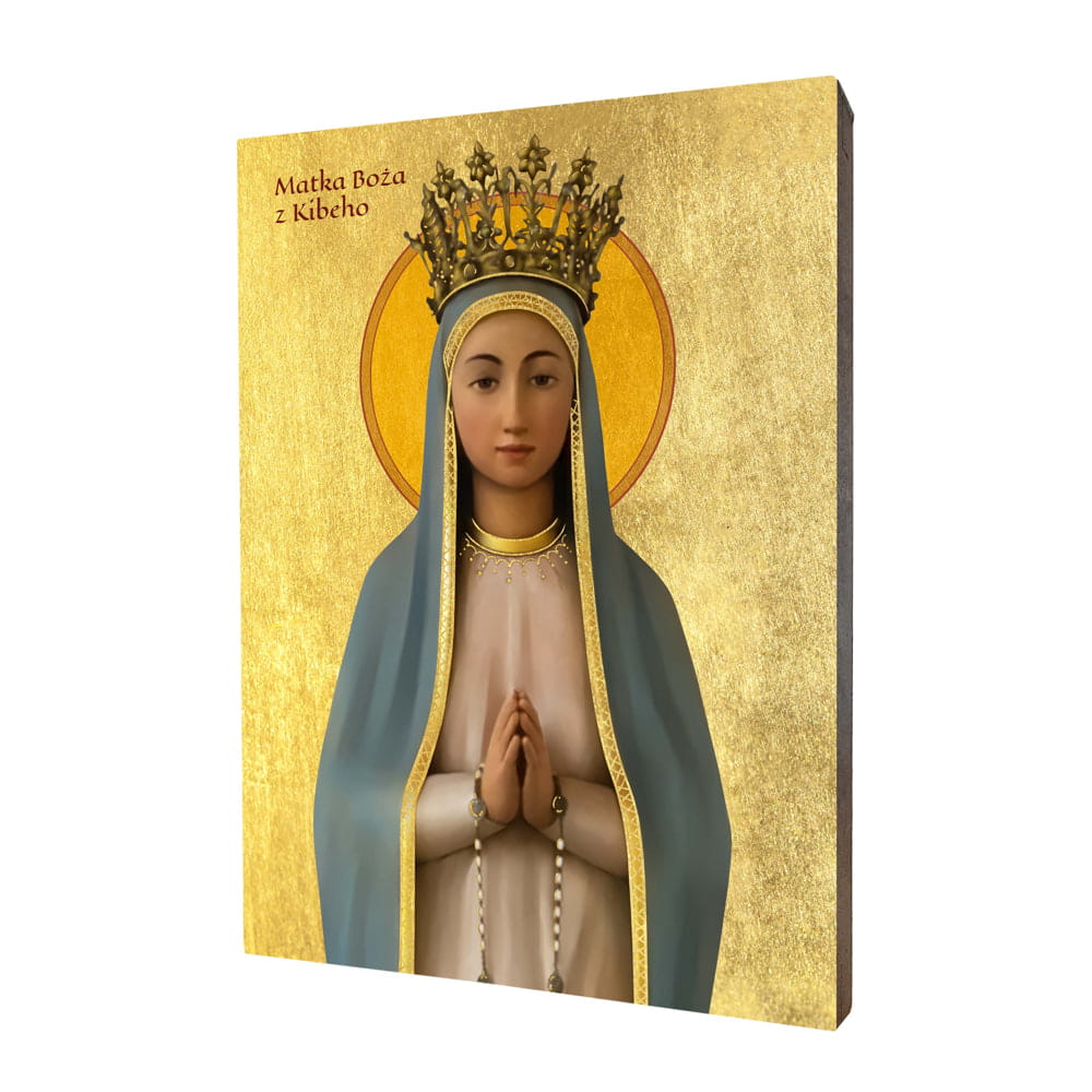 Ikona Matka Boża z Kibeho wykonana na desce lipowej, podwójnie gruntowanej oraz uszlachetnionej płatkami pozłoty. Wizerunek Maryi został naniesiony przy użyciu specjalnej techniki druku bezpośrednio na deskę.