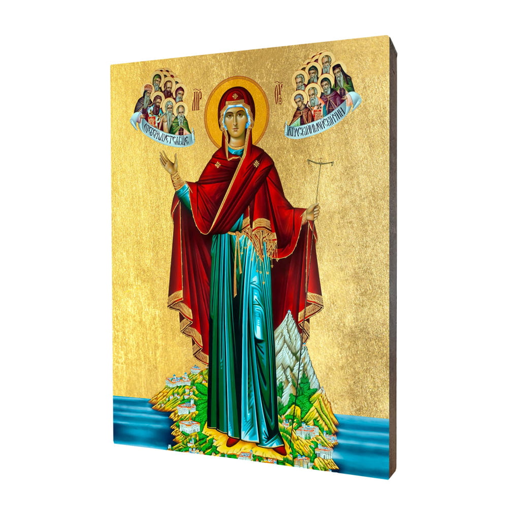 Ikona religijna Matka Boża Panagia z góry Athos wykonana na desce lipowej, podwójnie gruntowanej oraz uszlachetnionej płatkami pozłoty. Ikona z tyłu posiada certyfikat. Dzięki estetycznemu wykończeniu ikona może stanowić niezwykły upominek religijny na każdą okazję.