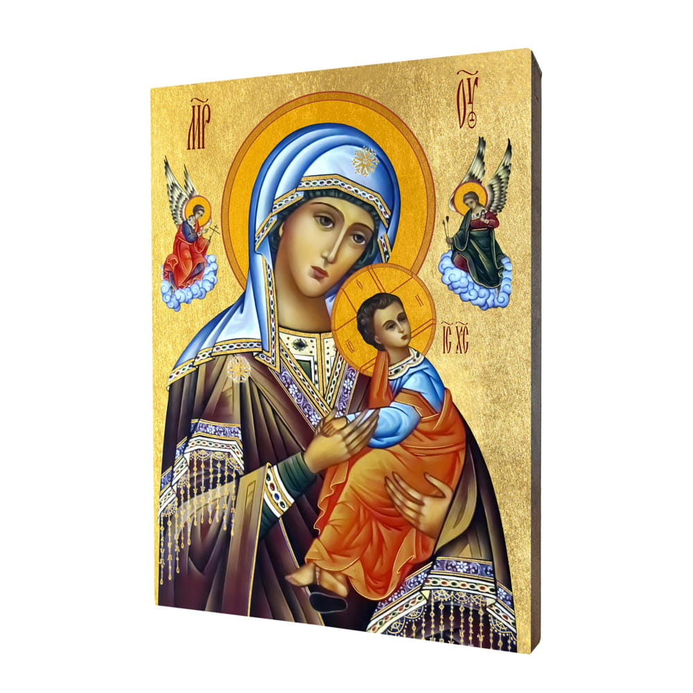 Ikona religijna z Matką Bożą wykonana na desce lipowej, podwójnie gruntowanej oraz uszlachetnionej płatkami pozłoty. Ikona z tyłu posiada certyfikat. Dzięki estetycznemu wykończeniu ikona może stanowić niezwykły upominek religijny na każdą okazję.