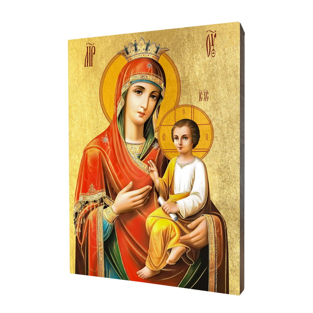 Iwerska ikona Matki Bożej wykonana na desce lipowej, podwójnie gruntowanej oraz uszlachetnionej płatkami pozłoty. Ikona z tyłu posiada certyfikat. Dzięki estetycznemu wykończeniu ikona może stanowić niezwykły upominek religijny na każdą okazję.