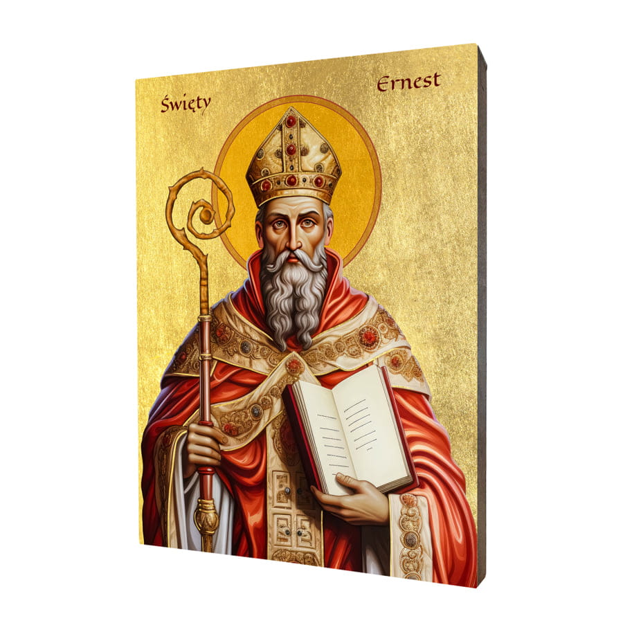 Ikona oddaje szczegóły postaci Świętego Ernesta z dbałością o każdy element. Jego spokojne spojrzenie, postura modlitewna i gesty są ukazane w sposób, który oddaje głębię duchowości tej postaci.