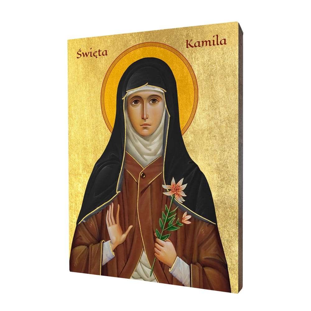 Ikona religijna świętej Kamili wykonana na desce lipowej, podwójnie gruntowanej oraz uszlachetnionej płatkami pozłoty. Wizerunek świętej Kamili został naniesiony przy użyciu specjalnej techniki druku bezpośrednio na deskę.
