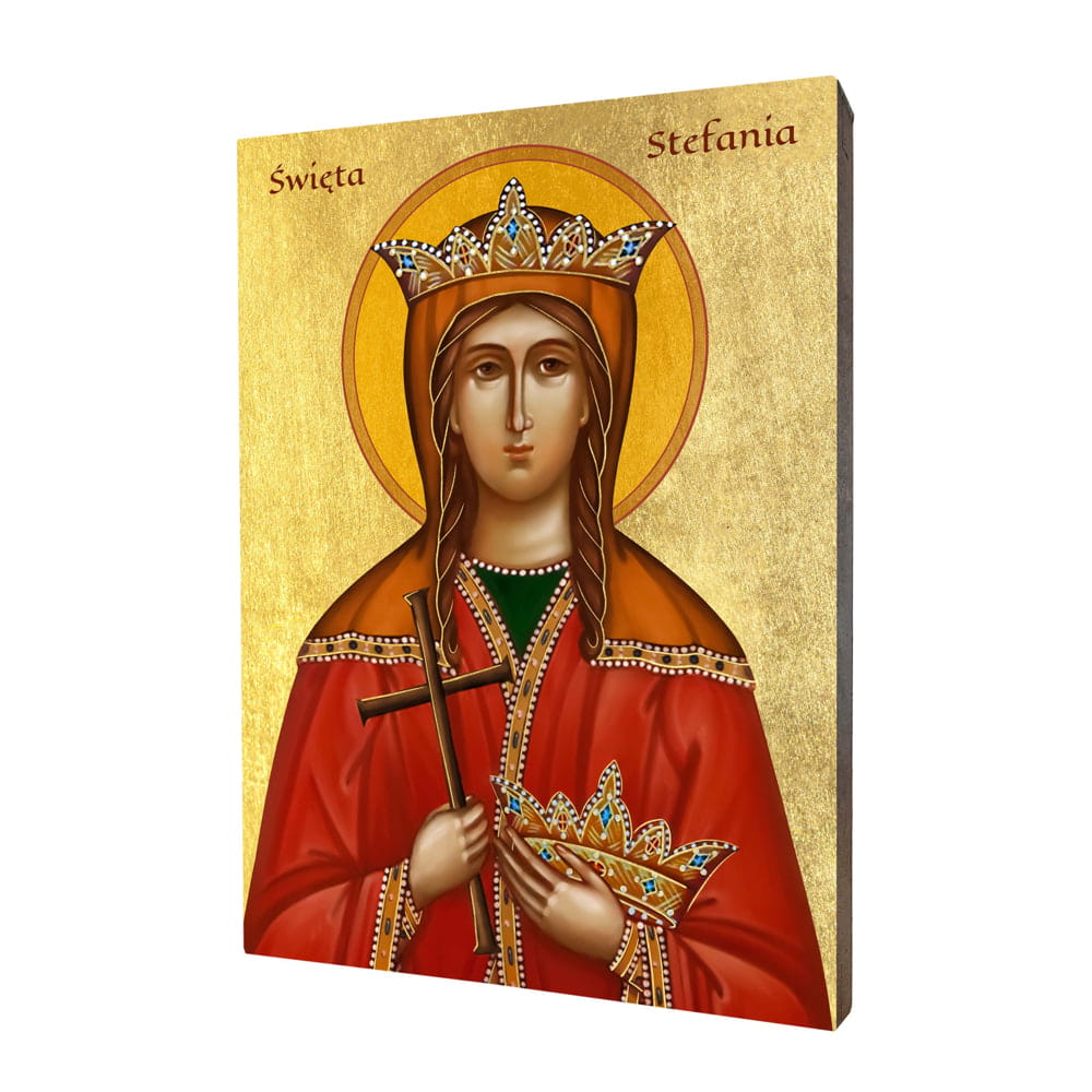 Ikona świętej Stefanii wykonana na desce lipowej, podwójnie gruntowanej oraz uszlachetnionej płatkami pozłoty. Wizerunek świętej Stefanii został naniesiony przy użyciu specjalnej techniki druku bezpośrednio na deskę.