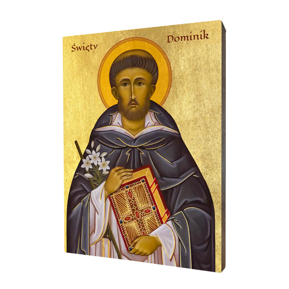 Ikona świętego Dominika wykonana na desce lipowej, podwójnie gruntowanej oraz uszlachetnionej płatkami pozłoty. Wizerunek św. Dominika został naniesiony przy użyciu specjalnej techniki druku bezpośrednio na deskę.