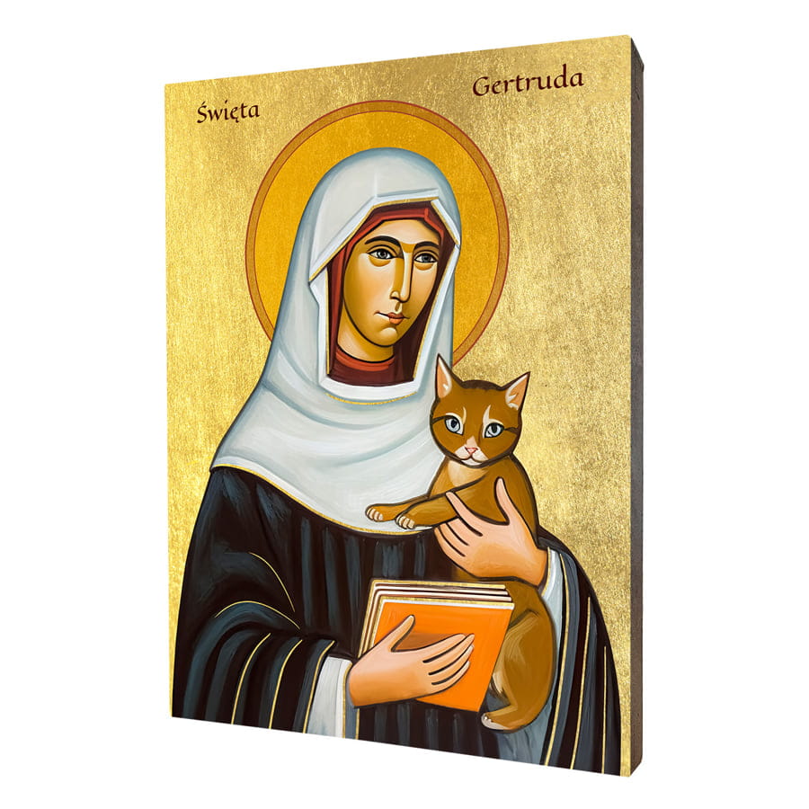 Ikona precyzyjnie ukazuje szczegóły postaci Świętej Gertrudy. Jej spokojne spojrzenie, skupienie w modlitwie, a także symbole związane z jej życiem zakonnym są przedstawione z dbałością o każdy niuans, emanując siłą i pokojem ducha.