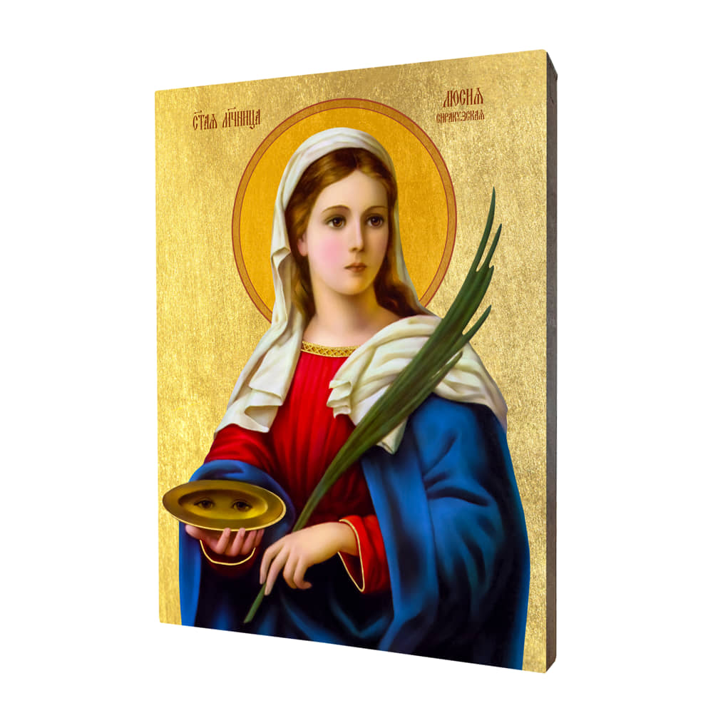 Ikona z wizerunkiem św. Łucji wykonana na desce lipowej, podwójnie gruntowanej oraz uszlachetnionej płatkami pozłoty. Wizerunek św. Łucji został naniesiony przy użyciu specjalnej techniki druku bezpośrednio na deskę.