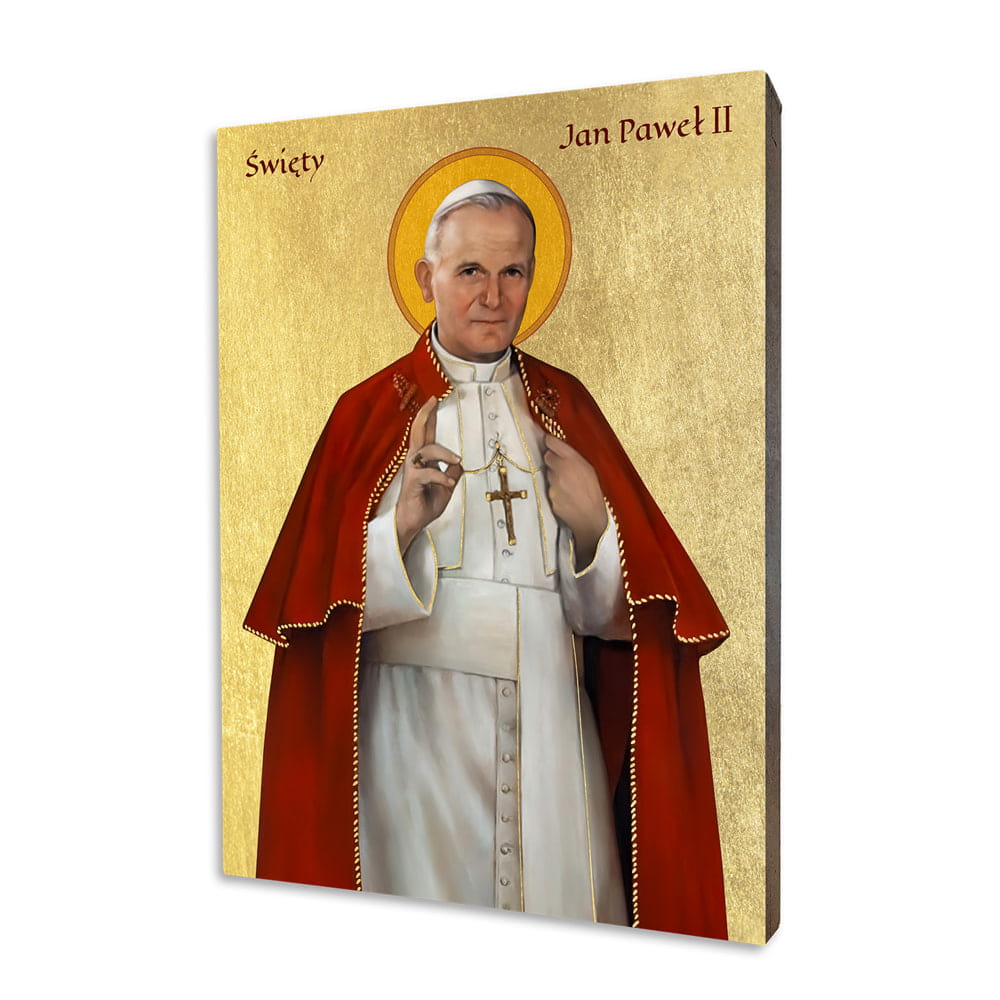 Ikona osobliwa Świętego Jana Pawła II ukazuje szczegóły postaci z niezwykłą starannością. Jego wyraz twarzy, gesty i charakterystyczna postawa są przedstawione z pełnym szacunkiem dla dziedzictwa tego wielkiego papieża.