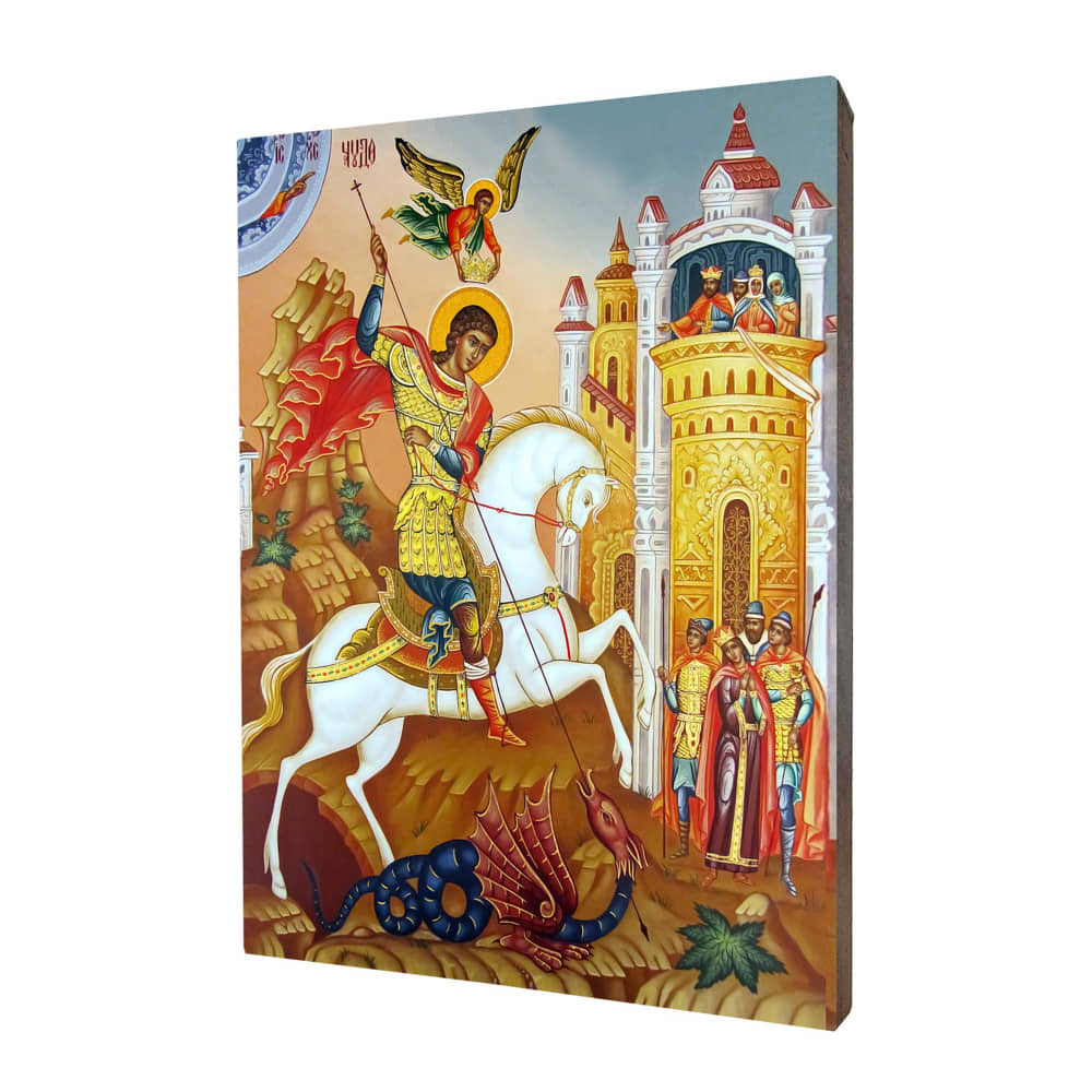 Ikona z świętym Jerzym wykonana na desce lipowej, podwójnie gruntowanej oraz uszlachetnionej płatkami pozłoty. Wizerunek świętego Jerzego zostało naniesione przy użyciu specjalnej techniki druku bezpośrednio na deskę.