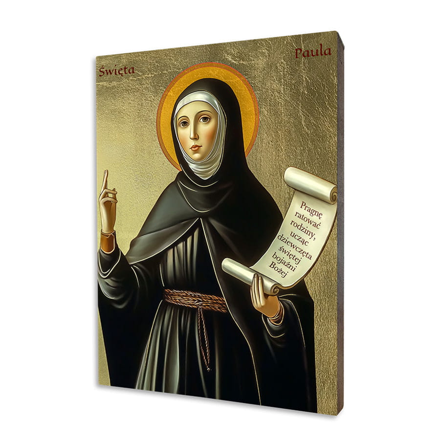 Ikona Świętej Pauli, stworzona na solidnej desce lipowej, harmonijnie łączy klasyczne elementy sztuki sakralnej z nowoczesnymi metodami produkcji. Święta Paula, znana ze swojego oddania Bogu i służby innym, stanowi wzór do naśladowania w duchowym życiu oraz realizacji wartości chrześcijańskich. Wizerunek tej świętej może być cenną inspiracją w codziennych modlitwach i refleksjach.