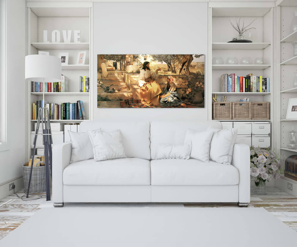 Obraz religijny na płótnie typu canvas przedstawiający scenę rozmowy Jezusa z Samarytanką. Obraz może stanowić doskonały prezent, a także może być pomocą w codziennej modlitwie.