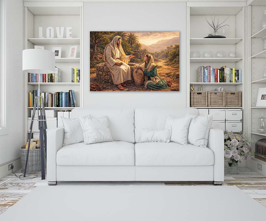 Obraz religijny na płótnie typu canvas przedstawiający scenę rozmowy Jezusa z Samarytanką. Obraz może stanowić doskonały prezent, a także może być pomocą w codziennej modlitwie.