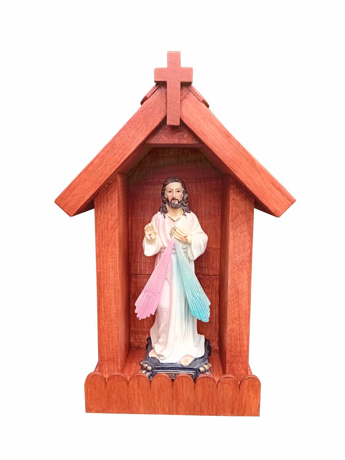 Kapliczka wykonana jest z drewna ŚWIERKOWEGO w kolorze mahoniowym, co nadaje jej elegancki i tradycyjny wygląd. Konstrukcja jest solidna, a wszystkie elementy są starannie dopasowane.