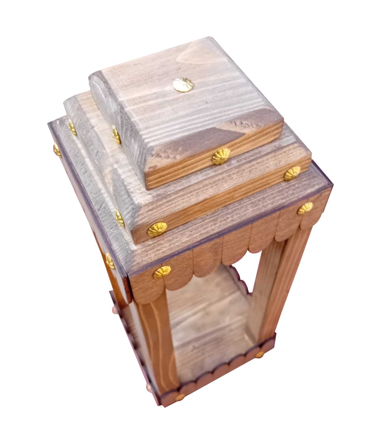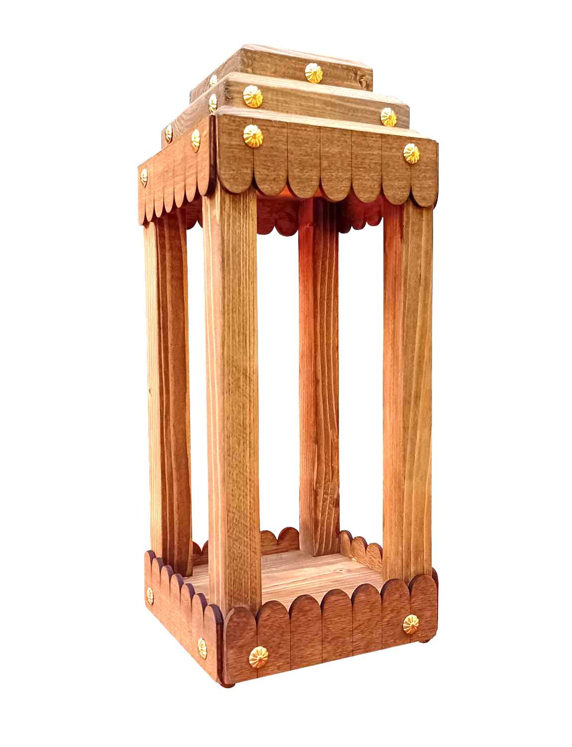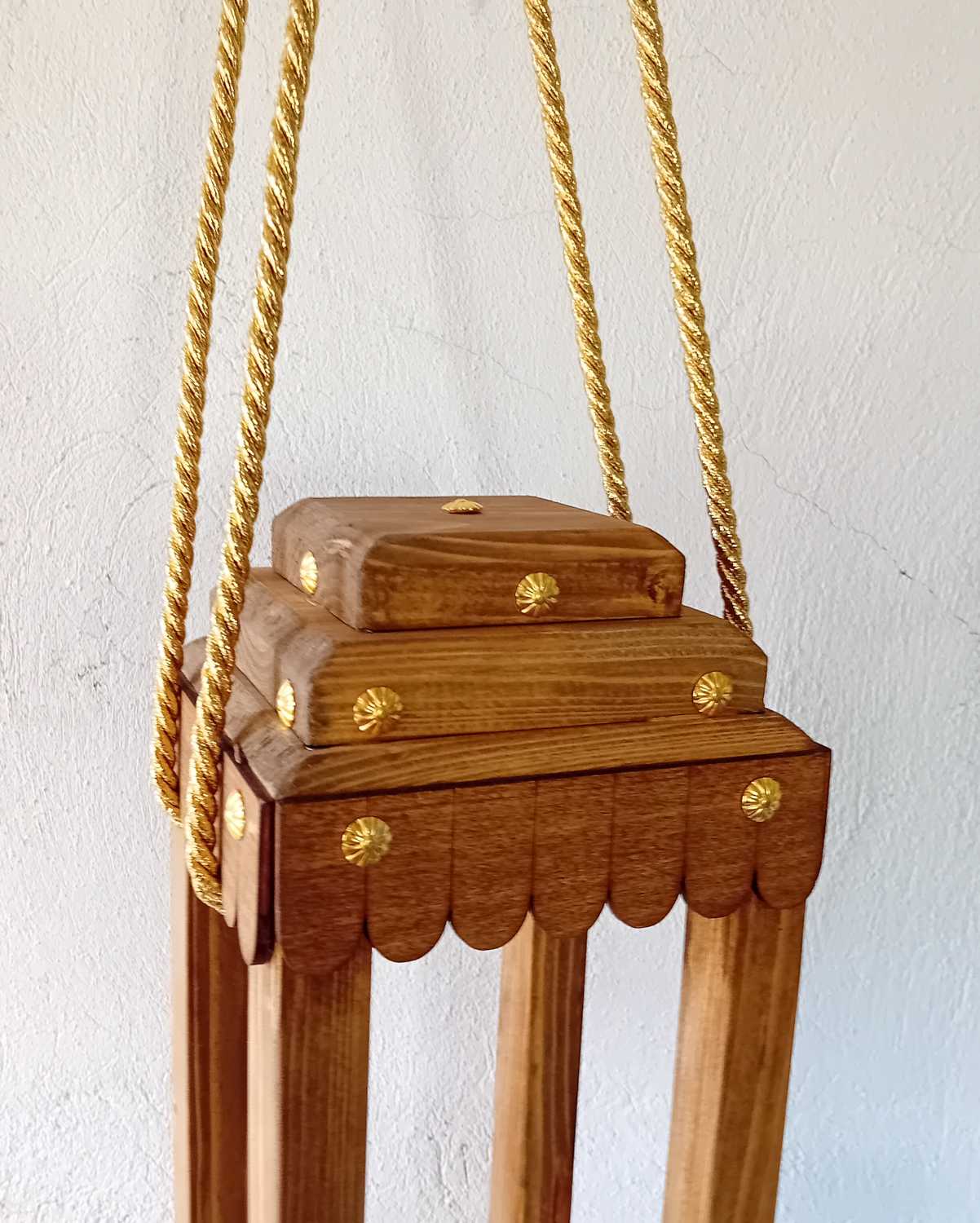 Lampion ozdobiony jest stylowymi gwoździami oraz ornamentami w stylu rzymskim i kaskadowym zadaszeniem co nadaje mu elegancki i klasyczny wygląd. Metalowe zdobienia w złotym kolorze pięknie kontrastują z naturalnym drewnem, podkreślając wyjątkowy charakter kapliczki. W wersji do zawieszenia oferujemy złoty pleciony sznur.