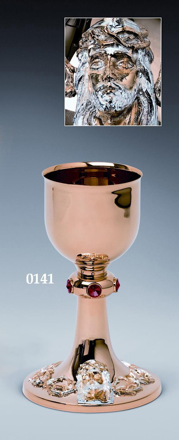 Kielich mszalny mosiężny dopracowany na połysk złocony 24 karatowym złotem. Na podstawie kielicha umieszczono twarz Jezusa oraz po obwodzie koronę cierniową. Nodus kielicha wysadzany kryształami Swarovskiego 5 szt.